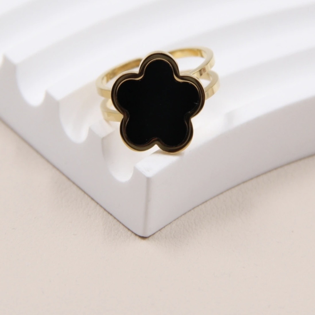 Cette bague Julie est une bague ouverte et ajustable en acier inoxydable. Elle présente au centre un motif de trèfle à 4 feuilles noir bordé d’un contour doré. L’anneau est double et ouvert à l’arrière, permettant d’ajuster la taille. Fabriquée en acier inoxydable de haute qualité, cette bague offre durabilité et confort au quotidien. Elle a un style chic, minimaliste et raffiné