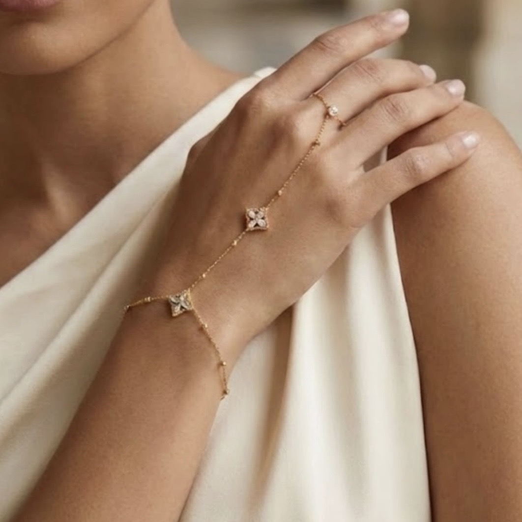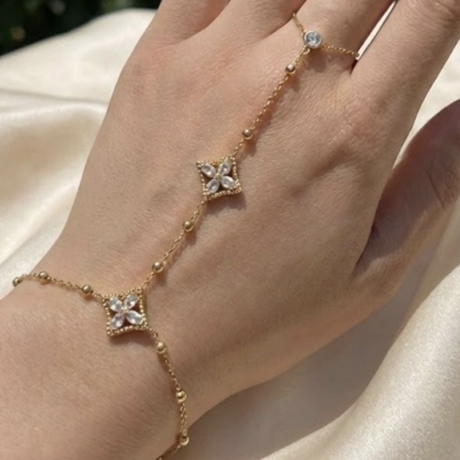 Elegant et raffiné, ce bracelet de main Satia en acier inoxydable doré sublime le poignet avec sa chaine délicate, ses motifs de fleurs ornés de nacre et sa touche de strass scintillant. Son design fin et féminin relie harmonieusement le poignet au doigt pour un effet bijou sophistiqué et tendance.