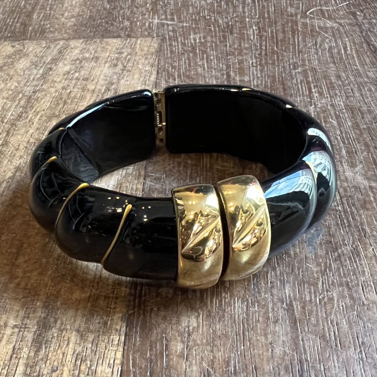 Cette manchette Alma noire est une manchette en acrylique et acier inoxydable