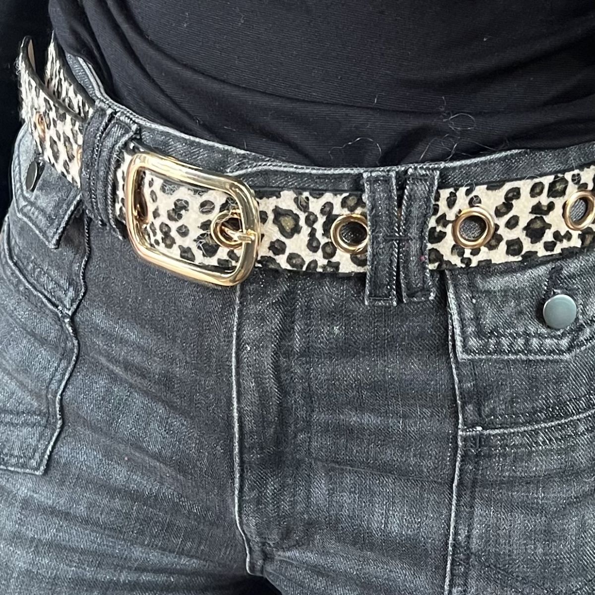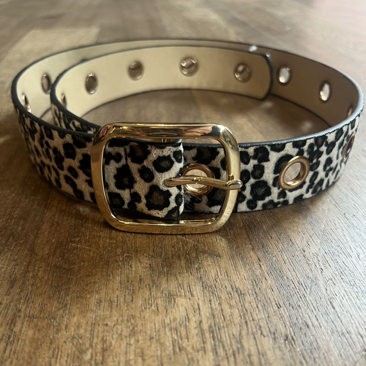 Cette ceinture leo beige et sa boucle dorée sera parfaite pour parfaire votre tenue. Elle a des œillets sur toute sa longueur, elle est donc adaptable à toutes les morphologies.