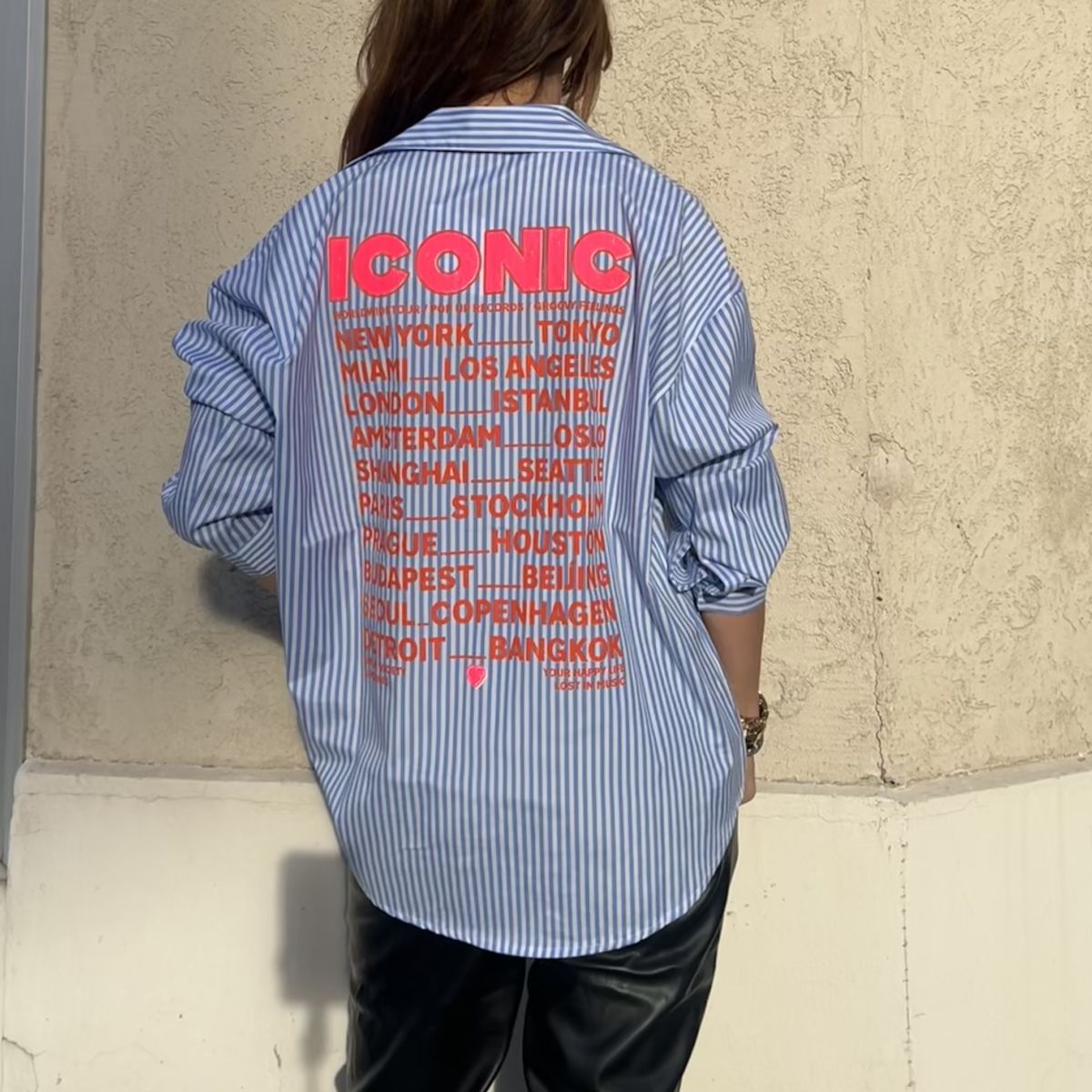 Cette chemise ICONIC à rayures blanches et bleues est le must-have de cette saison. Inscription rose fluo recto verso.