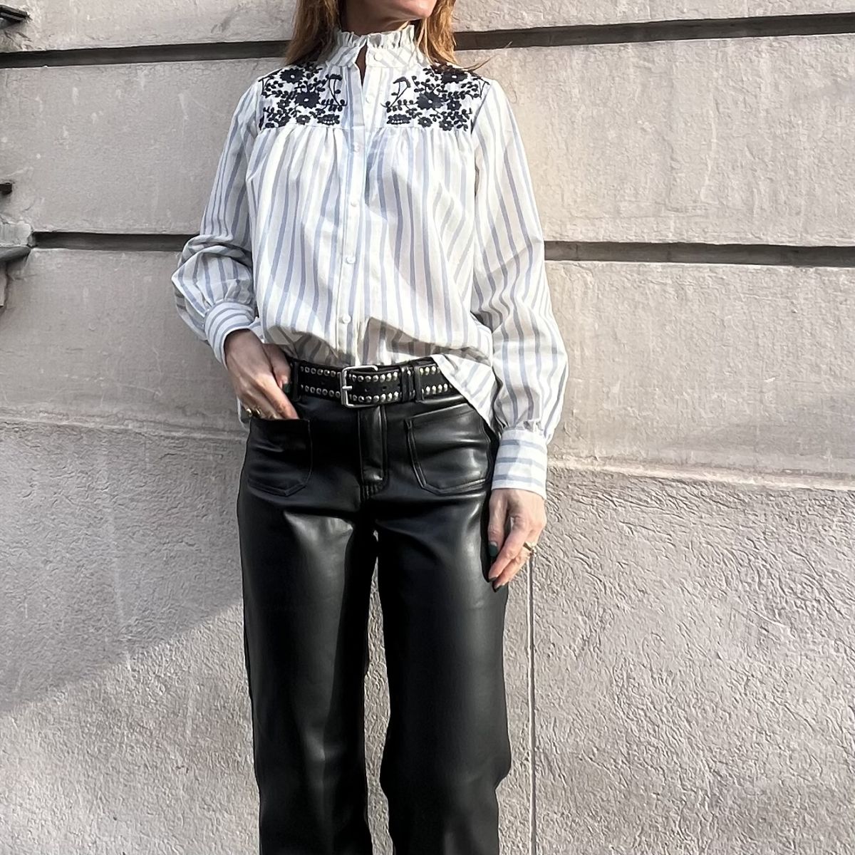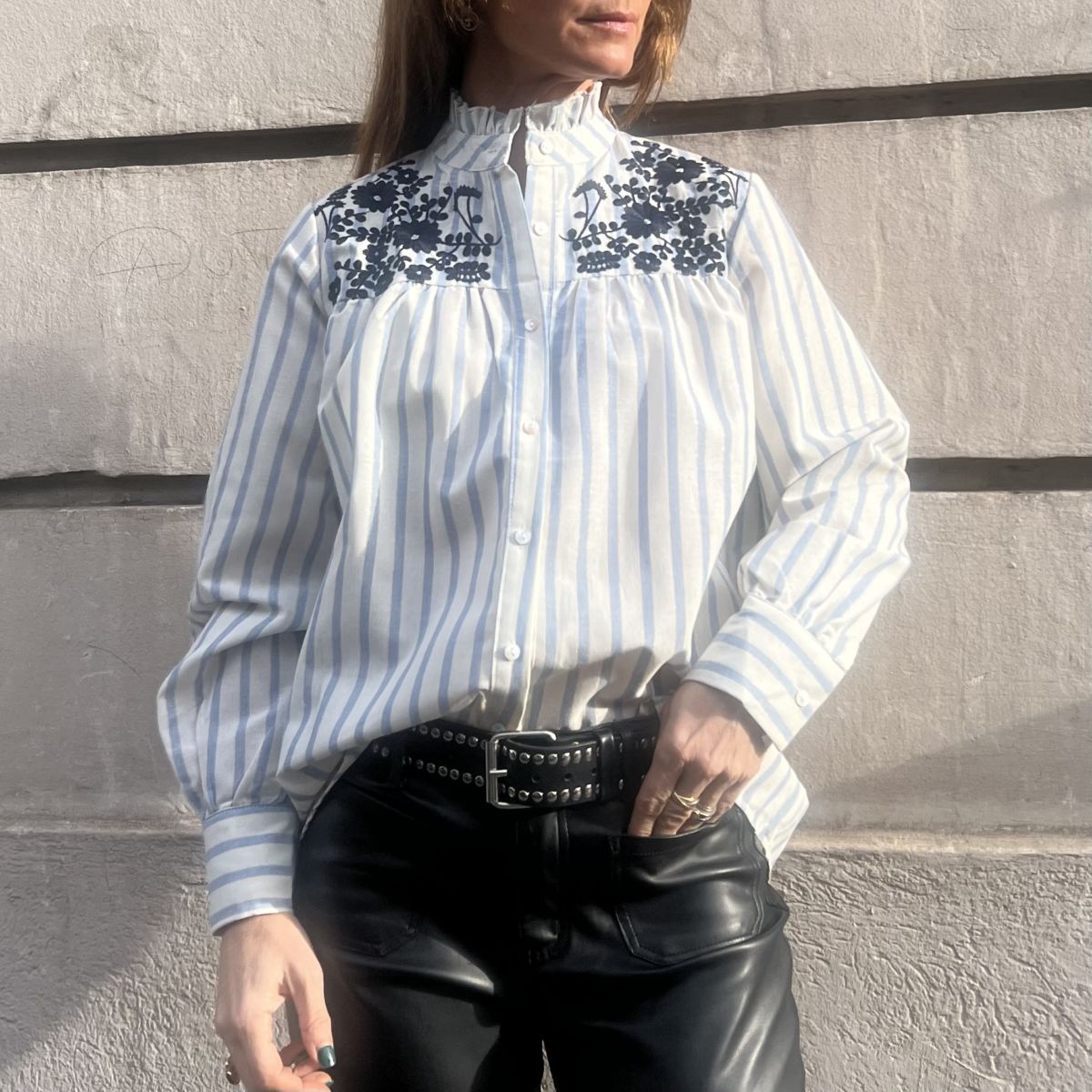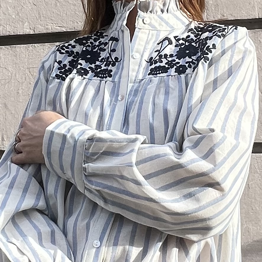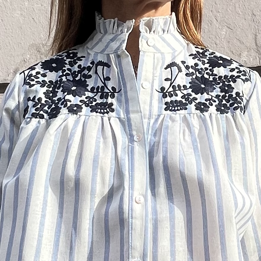 Cette chemise Margot est une chemise rayée blanc et bleu ciel avec de très fines rayures de lurex. Col montant à volant. Manches Longues ballon resserrées aux poignets. Broderies bleu marine sur l’avant. Fermeture boutonnée devant