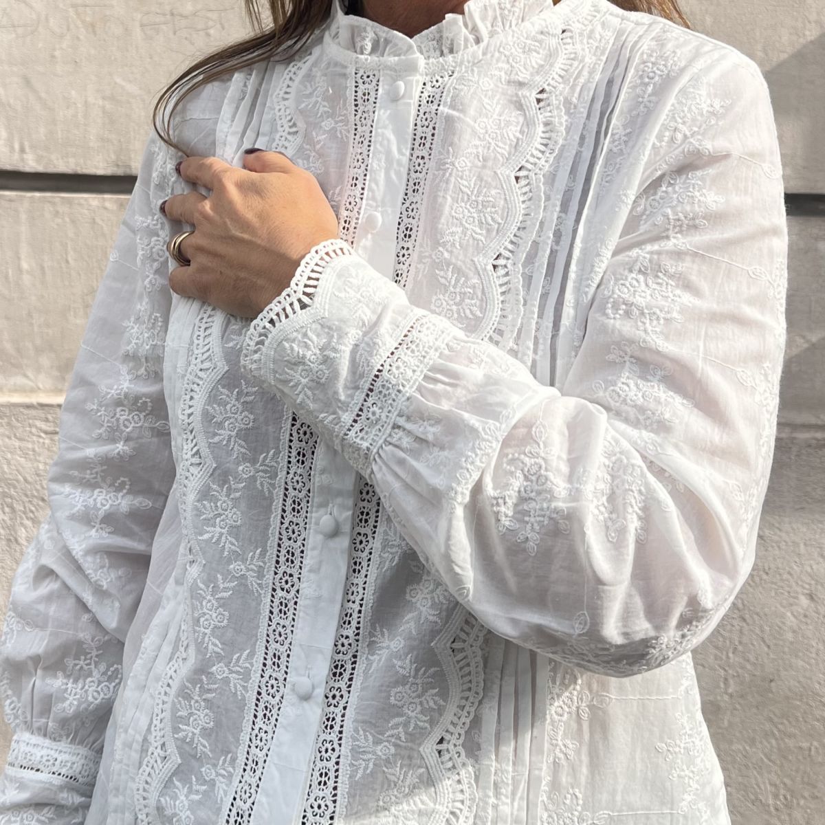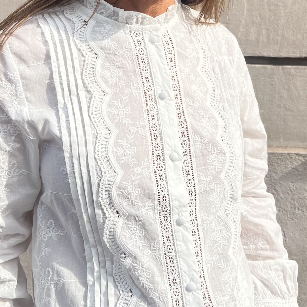 Apportez une touche féminine à votre garde-robe avec cette superbe chemise Suzie 100% coton avec de la dentelle et des broderies.