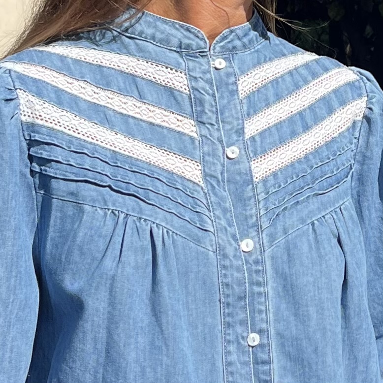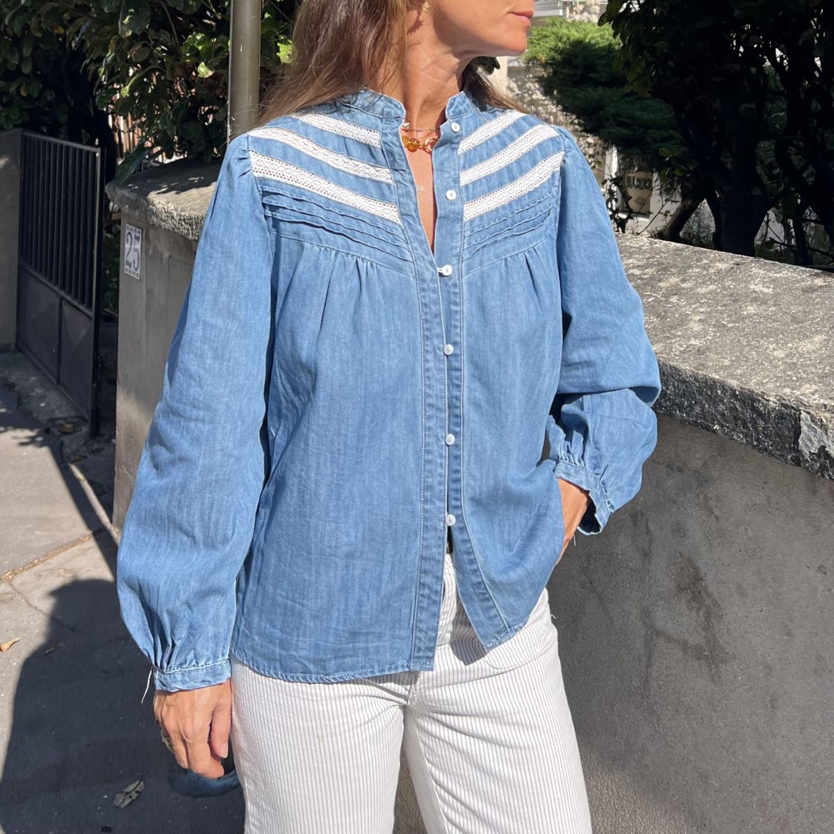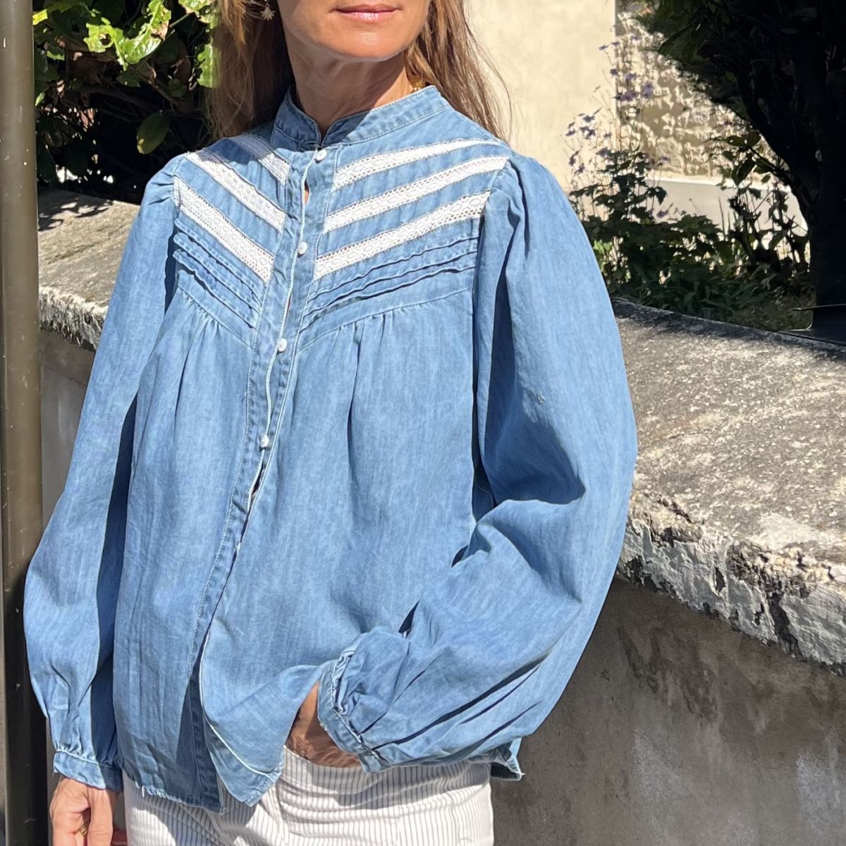 Cette chemise Victoria bleue est en jeans souple, manches longues, col rond style victorien. Bandes de dentelle, fermeture boutonnée devant. Coupe ample et fluide.