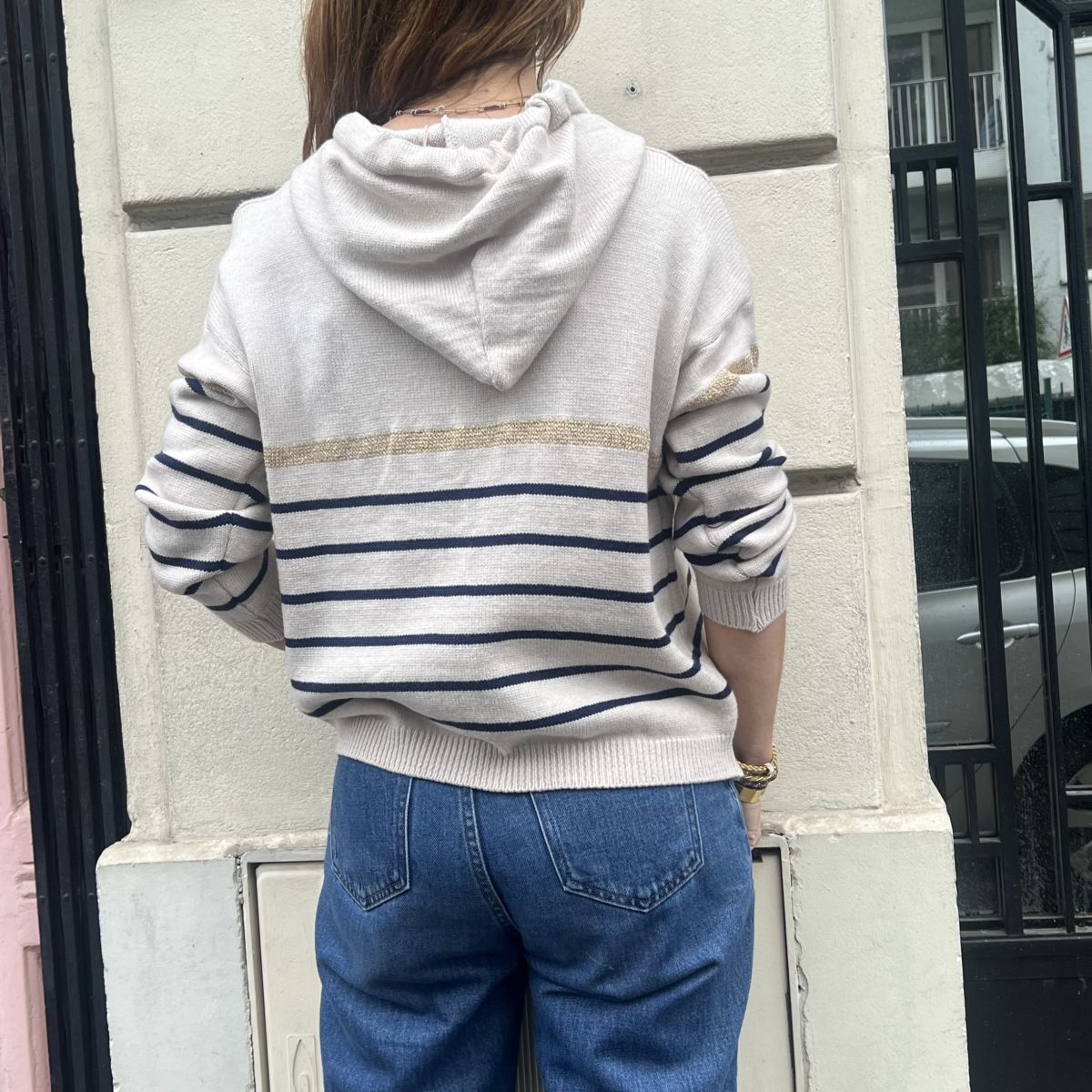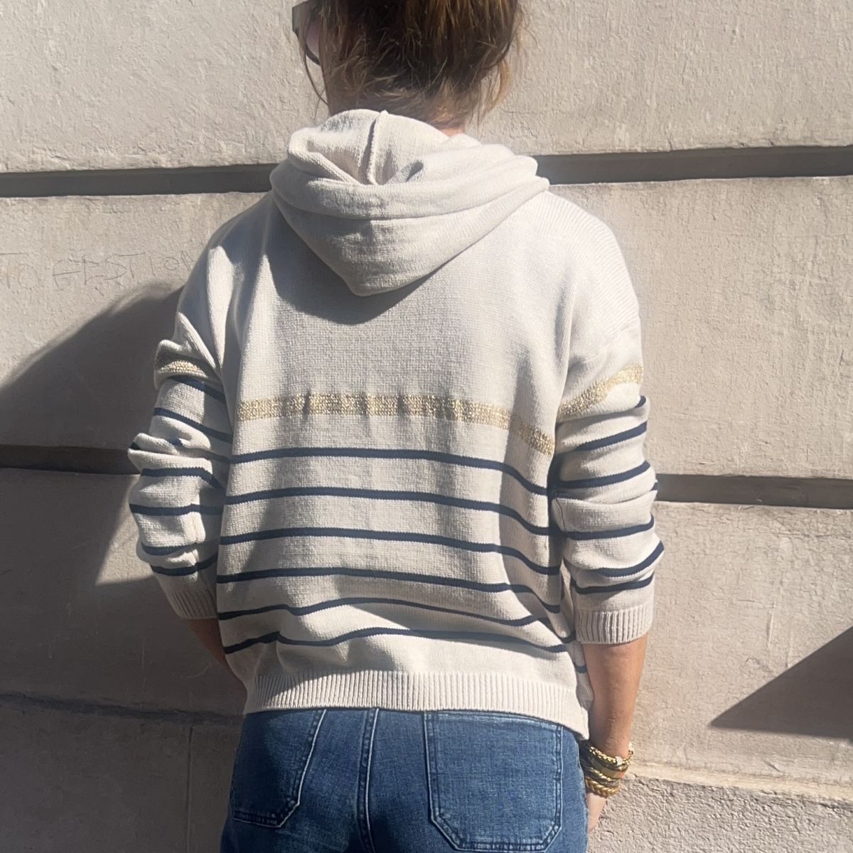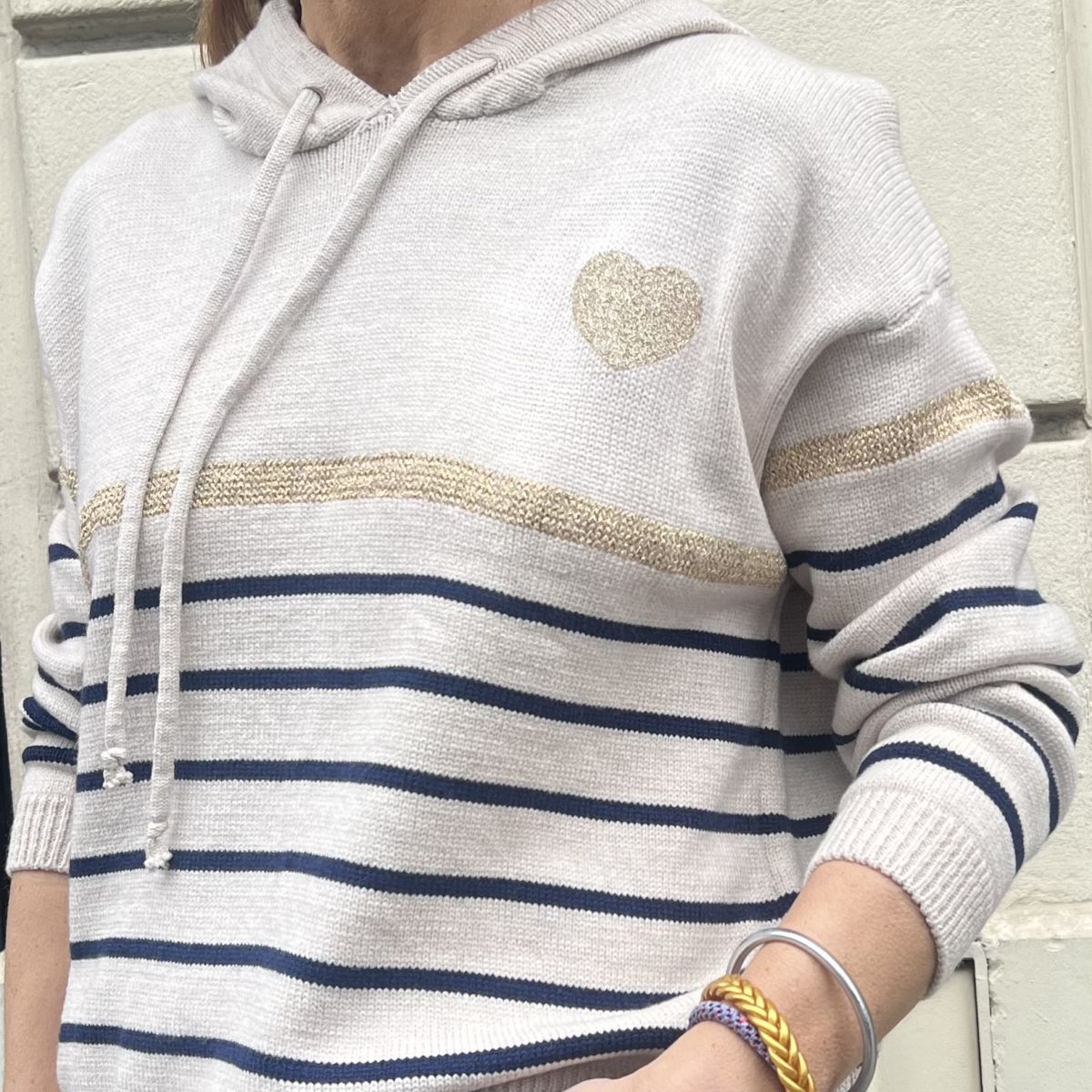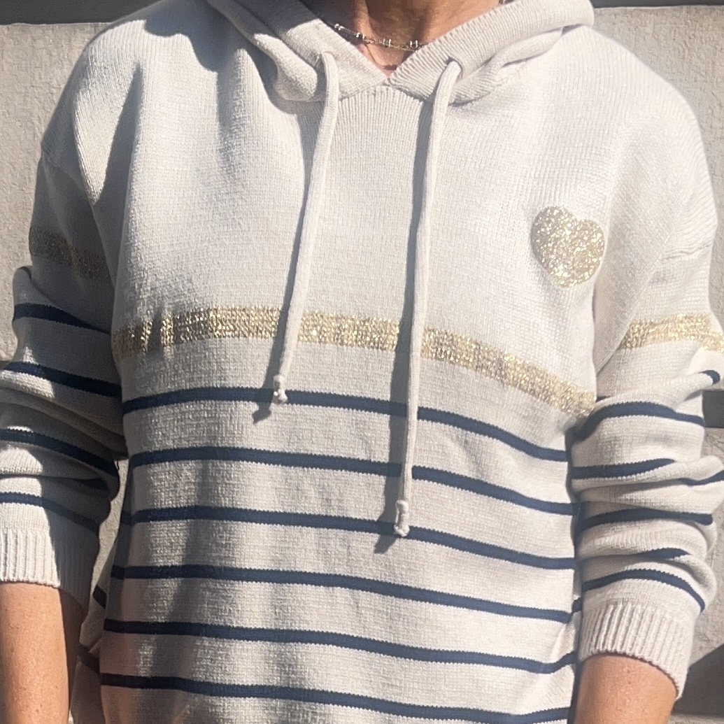 Ce pull Artus est un modèle à capuche, au style décontracté chic. Beige avec rayures bleu marine sur le bas du pull et les manches. Bande dorée scintillante et coeur doré brodé sur le côté gauche.