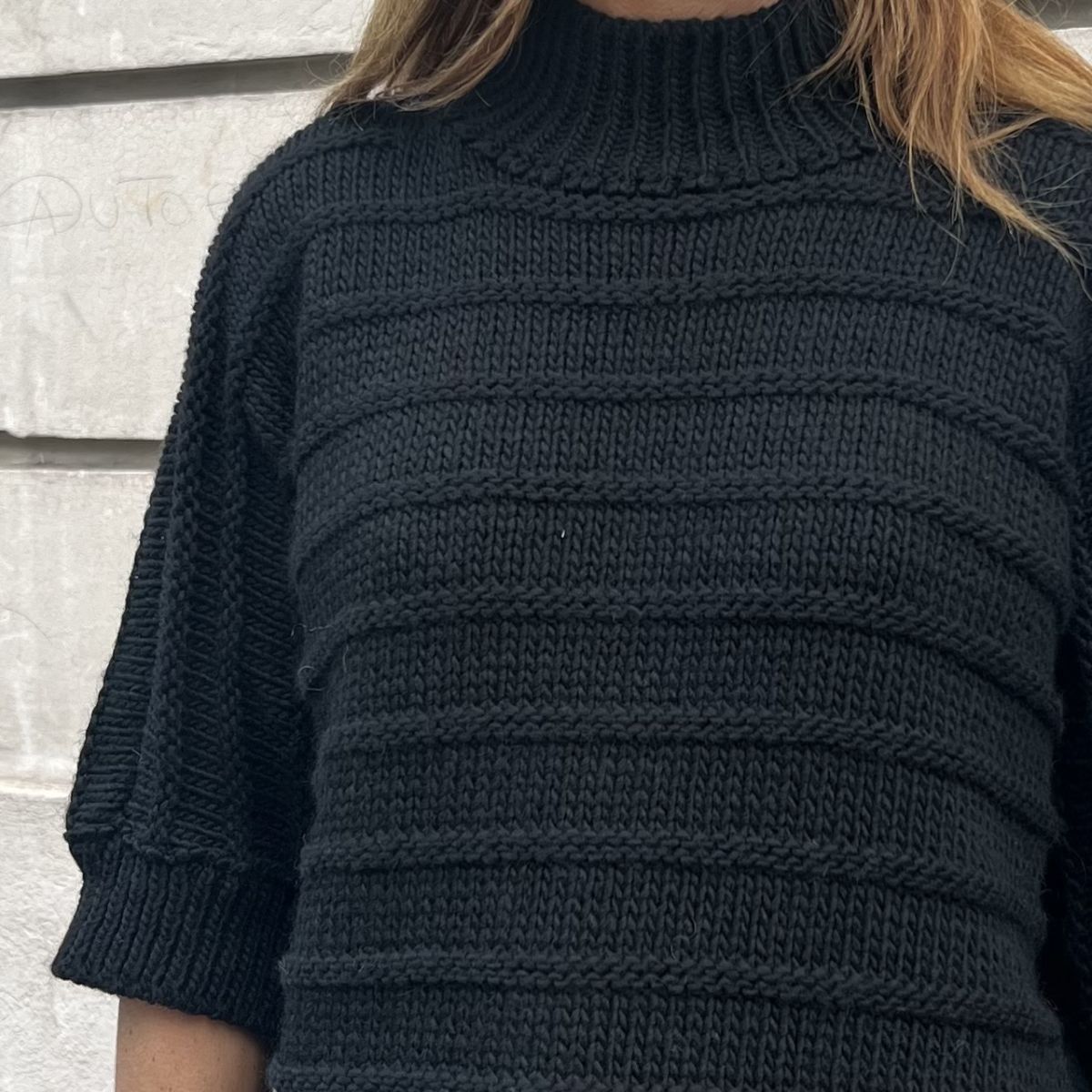Ce pull Gabrielle noir tout doux contient 10% de laine. Taille unique, manches 3/4, torsades, col cheminée. Existe dans 3 autres couleurs.