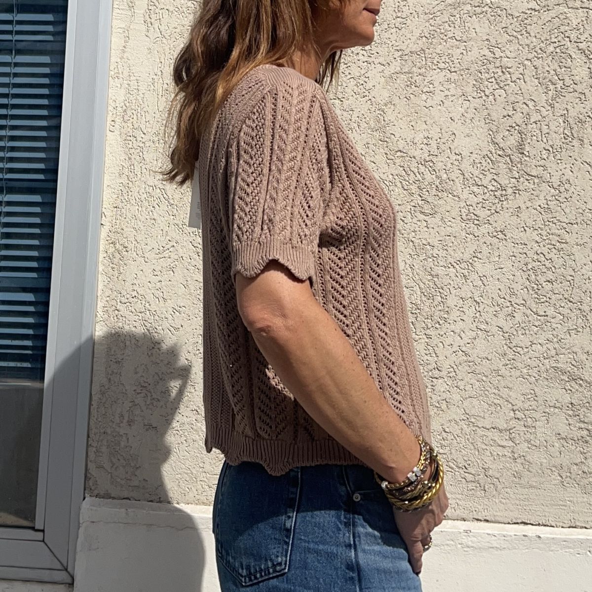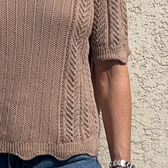 Ce pull Garance taupe est en maille fine ajourée donnant un effet dentelle. Il a un style féminin et délicatement travaillé avec une touche rétro. Coupe droite et ajustée. Manches courtes finies par un bord-côte discret légèrement ondulé rappelant le bas du pull. Col en V simple et flatteur. Taille unique