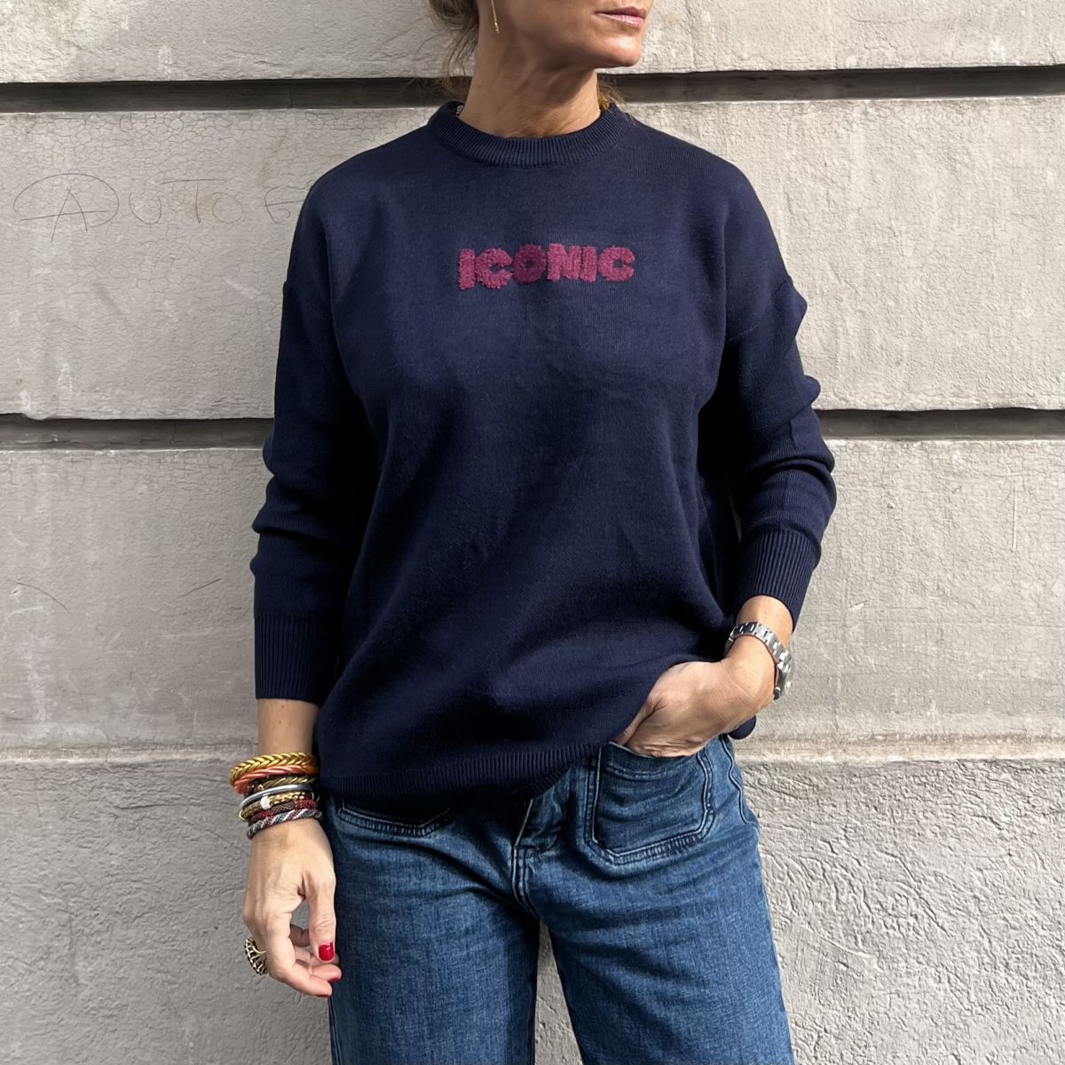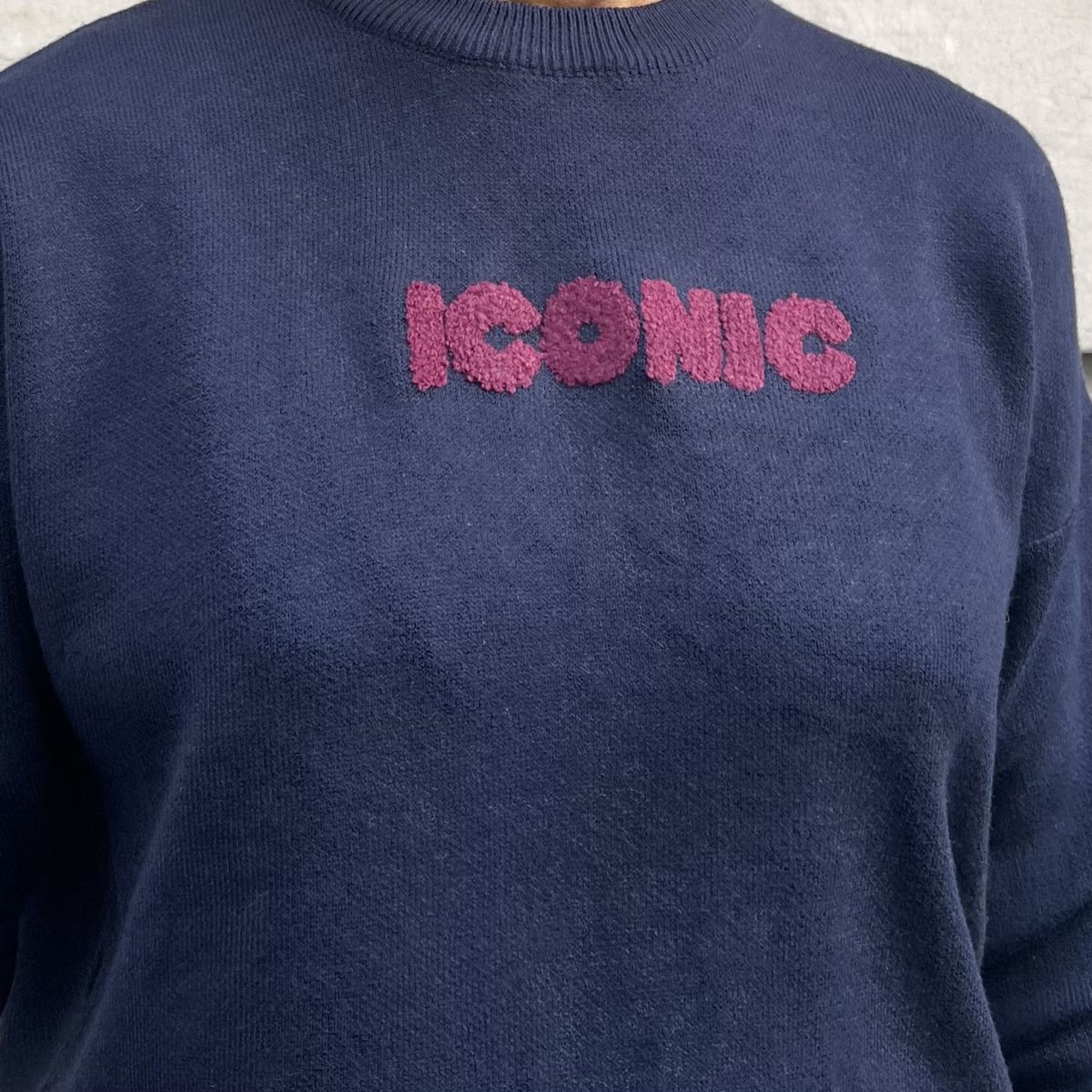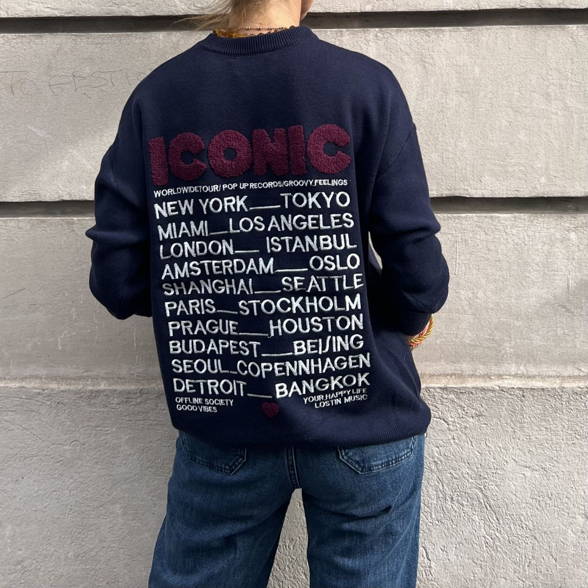 Ce pull « Iconic » bleu marine est un pull avec l’inscription « iconic » en moumoute bordeaux à l’avant et à l’arrière inscription « iconic » en moumoute bordeaux et plusieurs villes iconiques en broderie blanche.