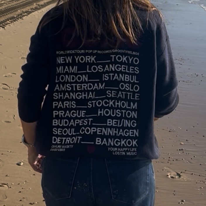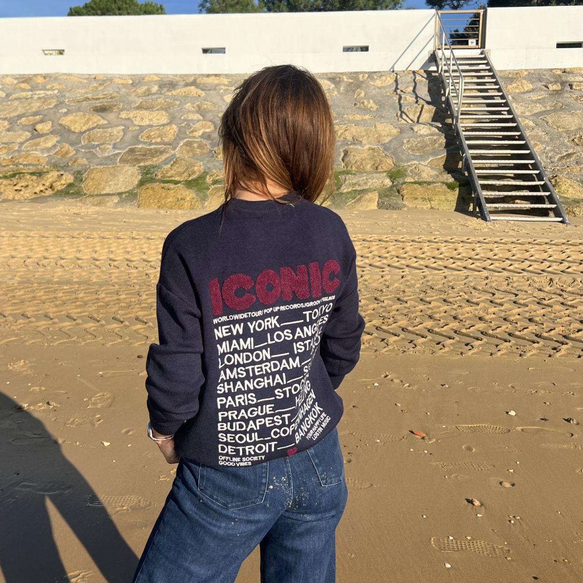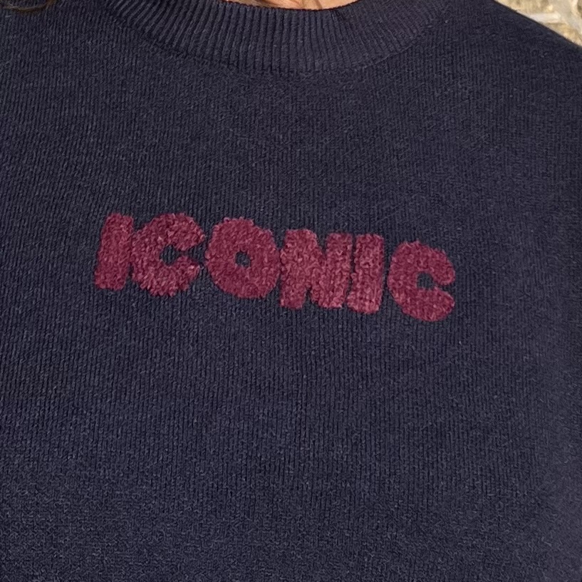 Ce pull « Iconic » bleu marine est un pull avec l’inscription « iconic » en moumoute bordeaux à l’avant et à l’arrière inscription « iconic » en moumoute bordeaux et plusieurs villes iconiques en broderie blanche.