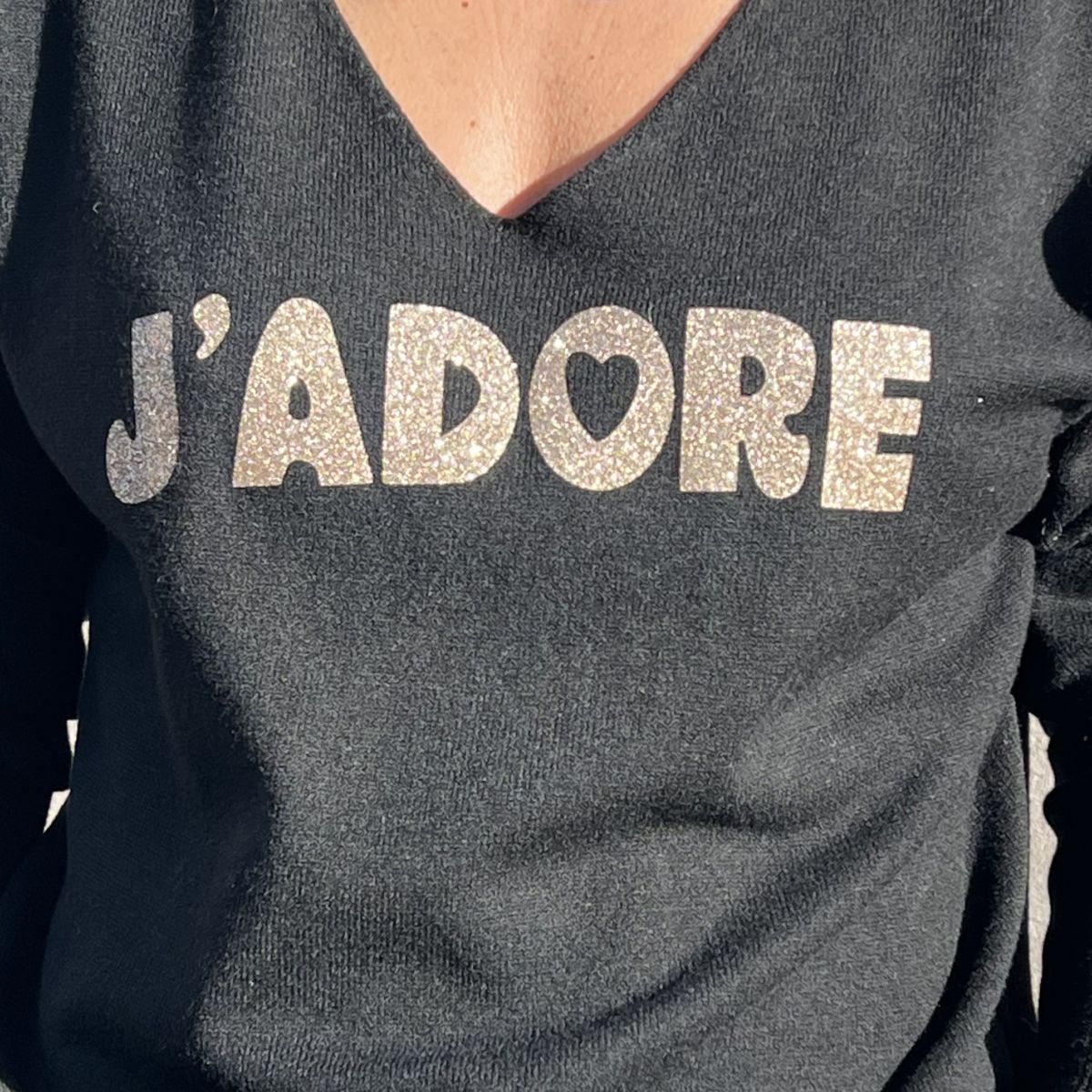 Ce pull J’adore noir et doré est un pull col en V à la coupe ample et confortable, facile à porter au quotidien. Matière douce et fluide, agréable sur la peau, avec une belle tenue. L’inscription « J’adore » apporte une touche tendance et féminine. Taille unique.