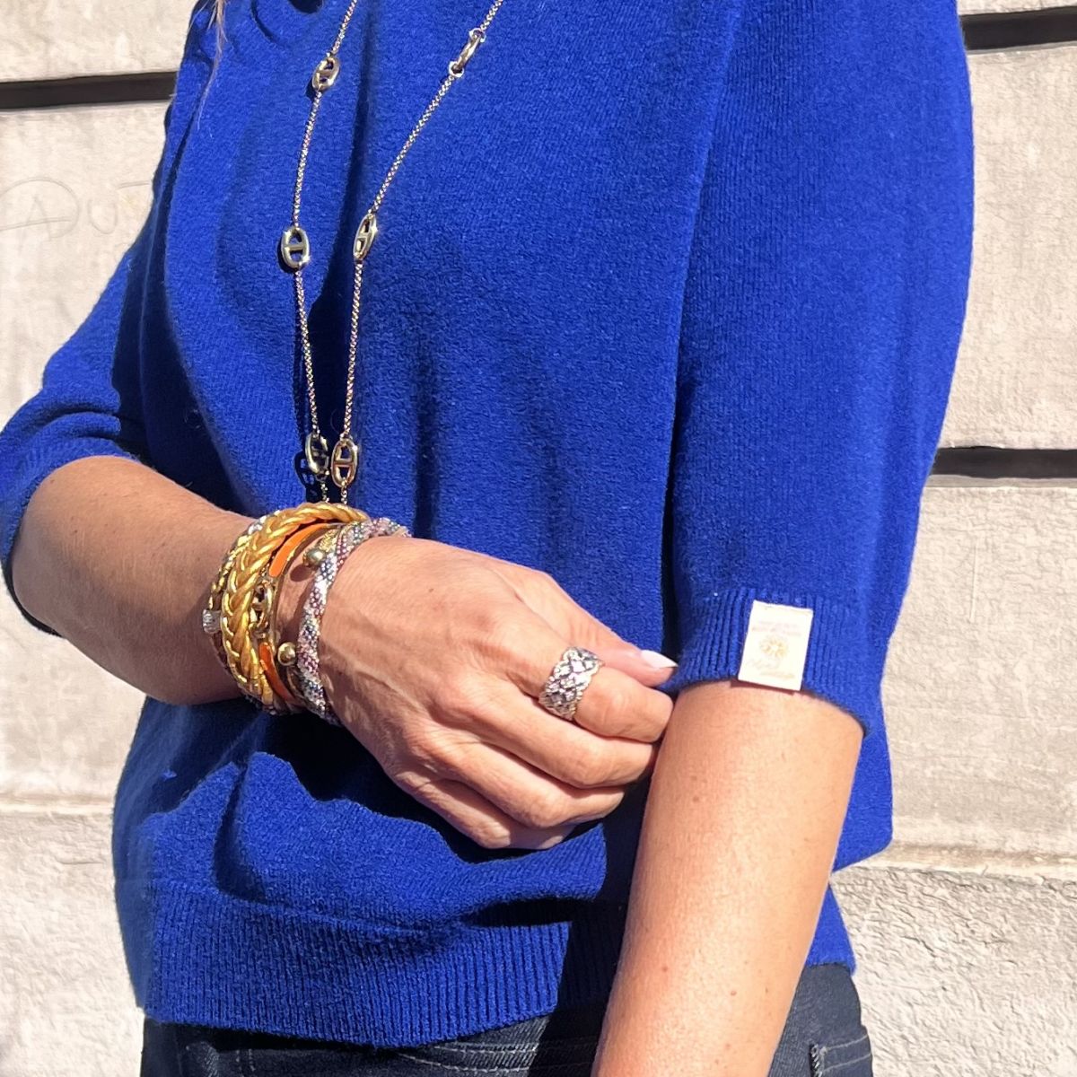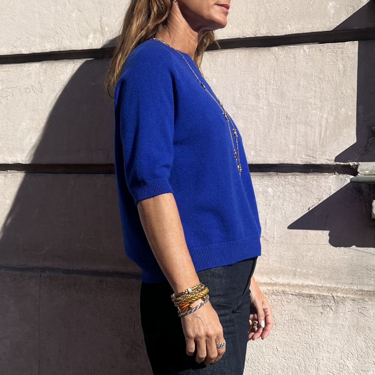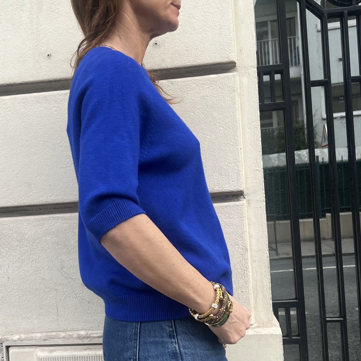 Ce pull Louisa bleu électrique est en maille fine avec des manches 3/4 et une encolure ronde classique. Coupe droite avec un large bord-côte en bas, ce qui lui donne une finition structurée. Petite étiquette discrète cousue sur la manche. Taille unique