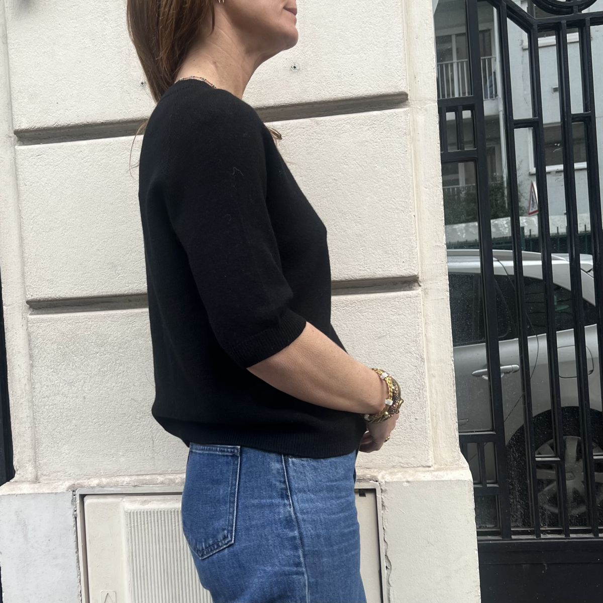 Ce pull Louisa noir est en maille fine avec des manches 3/4 et une encolure ronde classique. Coupe droite avec un large bord-côte en bas, ce qui lui donne une finition structurée. Petite étiquette discrète cousue sur la manche. Taille unique
