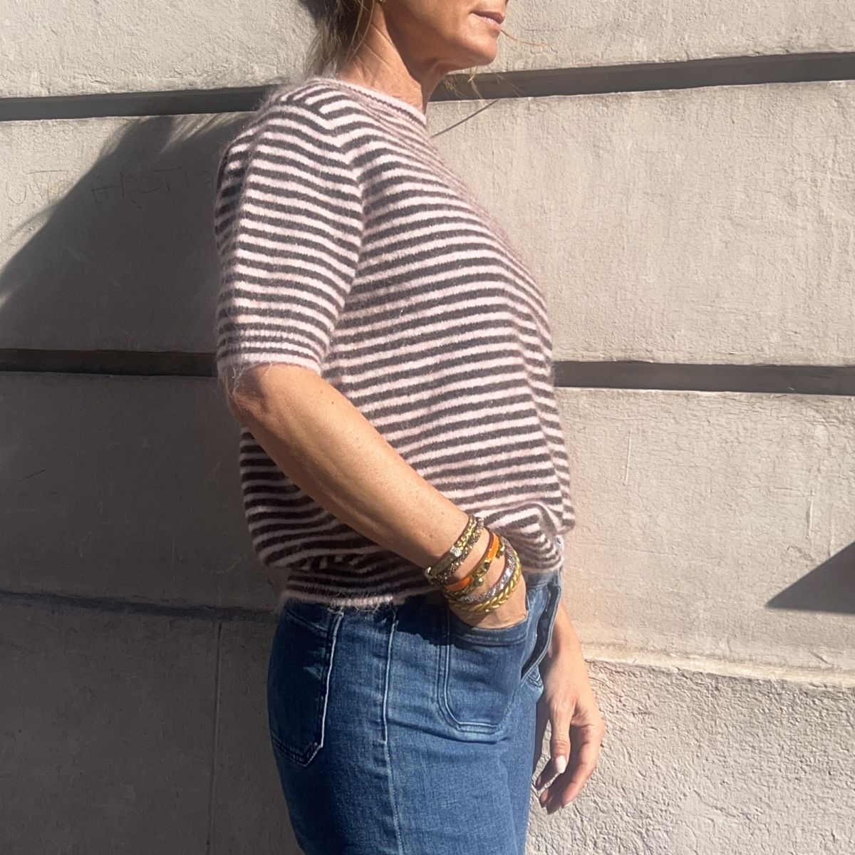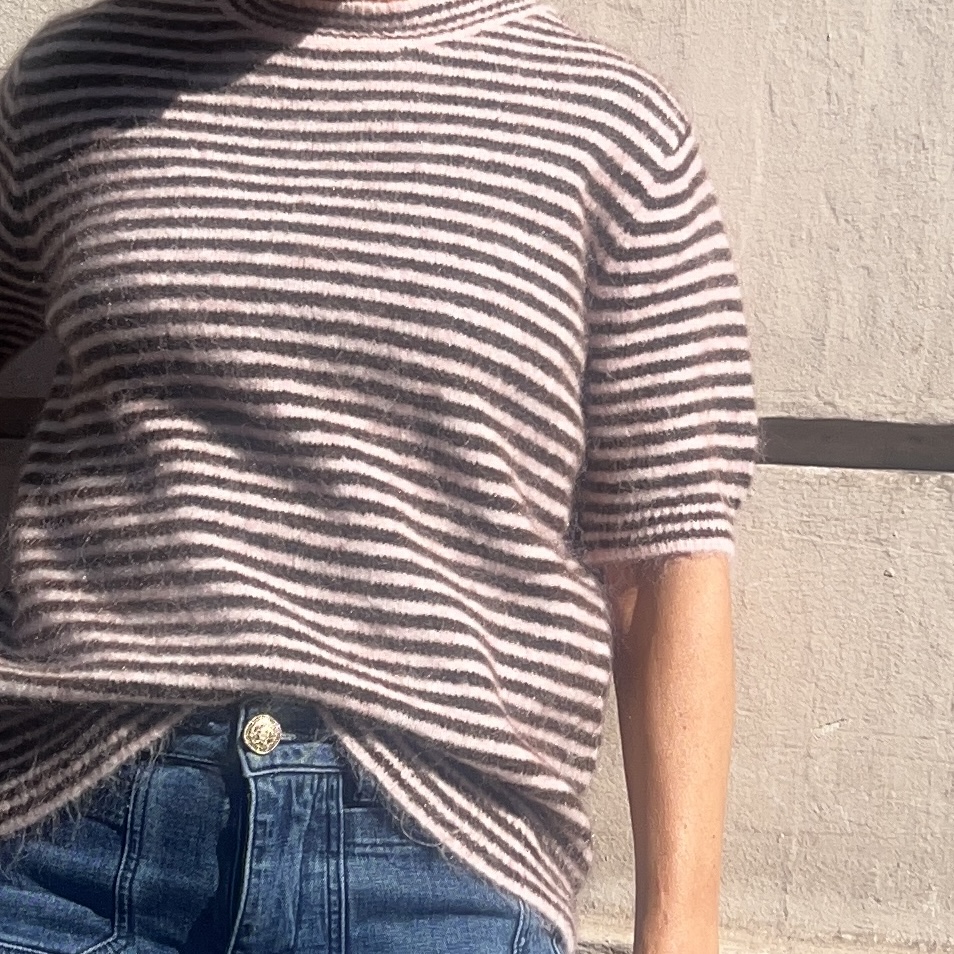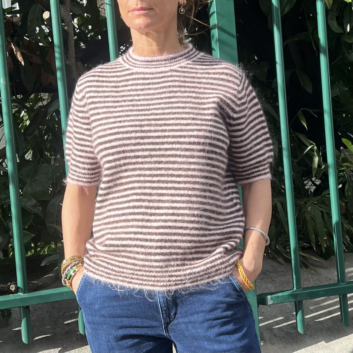 Ce pull Matilda est un pull à manches courtes en maille fine tout doux. Ses rayures rose poudrée et chocolat lui donnent un style vintage chic très facile à porter aussi bien en tenue casual que plus habillée.