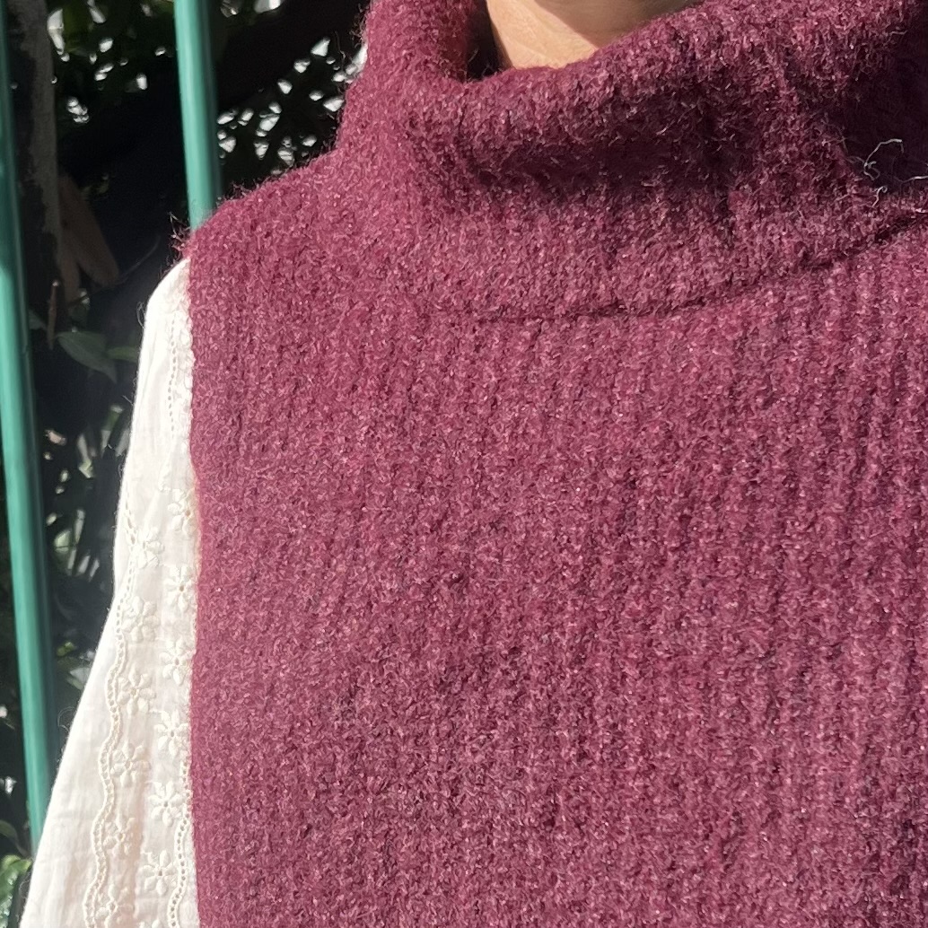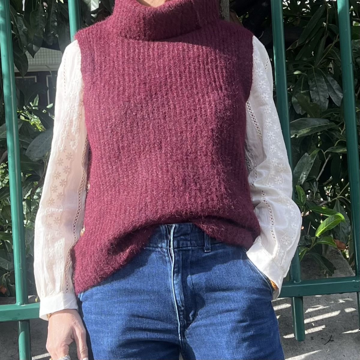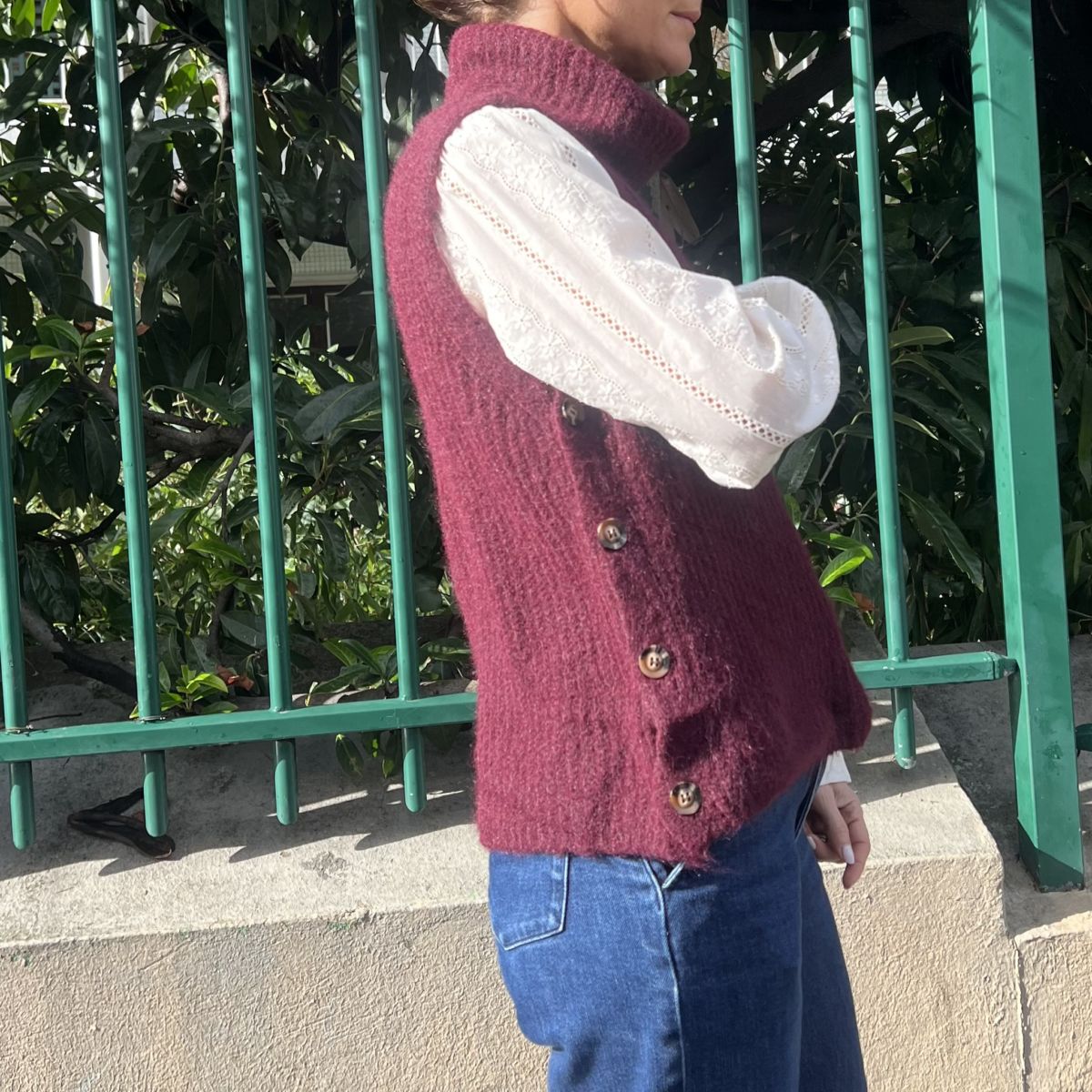 Ce pull Noam bordeaux est un pull sans manches parfait à superposer sur une chemise. Col roulé large et souple. Coupe droite légèrement ample. Détails de boutons sur les côtés.