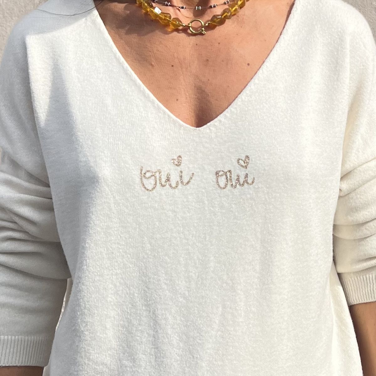 Pull en V – Inscription Oui Oui dorée – Taille unique