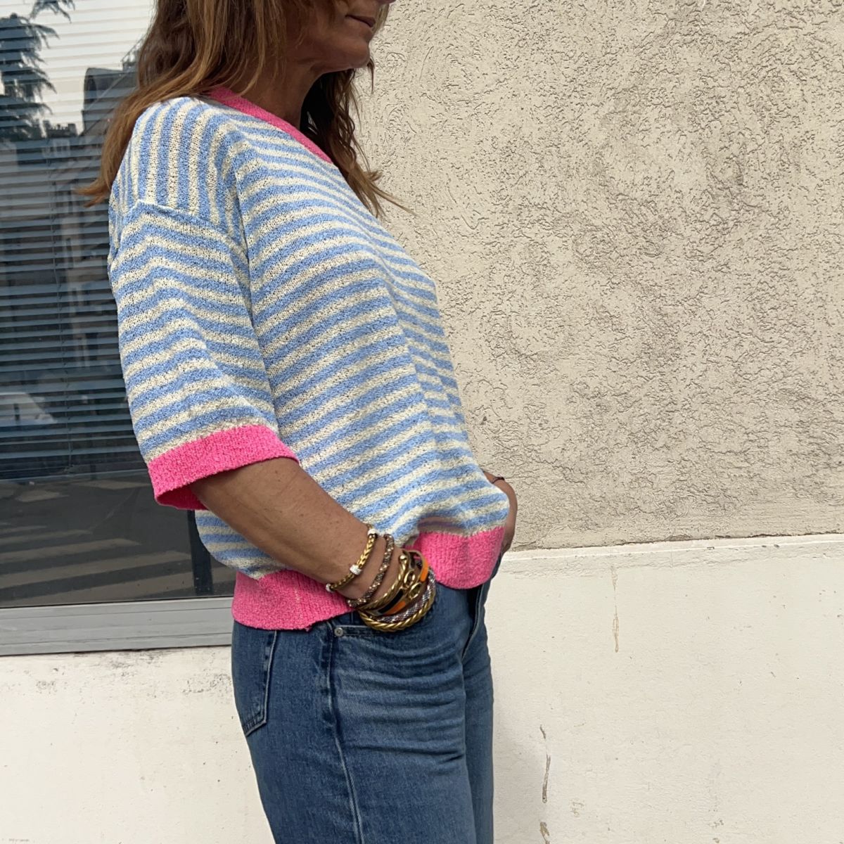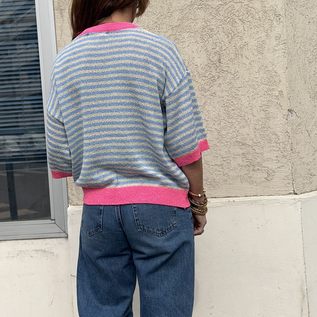 Ce pull Simon bleu est un pull à manches 3/4 en maille fine avec bordures rose fluo. Ses rayures bleues et blanches lui donnent un style vintage chic très facile à porter aussi bien en tenue casual que plus habillée.