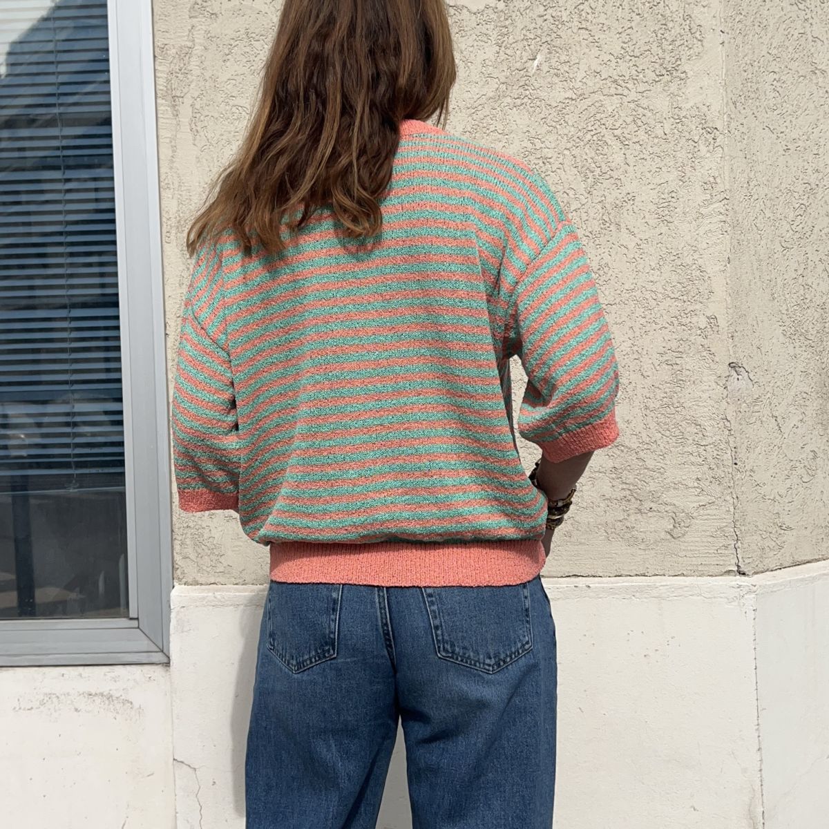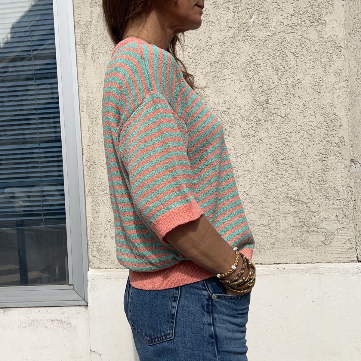 Ce pull Simon corail est un pull à manches 3/4 en maille fine avec bordures corail. Ses rayures corail et vertes lui donnent un style vintage chic très facile à porter aussi bien en tenue casual que plus habillée.
