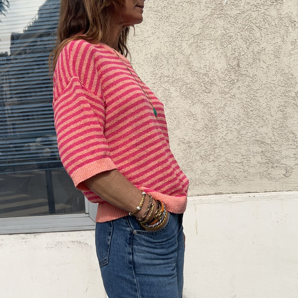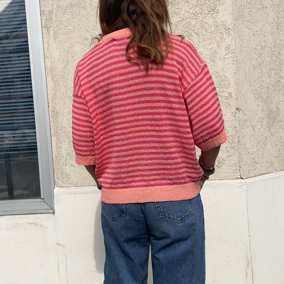 Ce pull Simon fuchsia est un pull à manches 3/4 en maille fine avec bordures corail. Ses rayures corail et fuchsia lui donnent un style vintage chic très facile à porter aussi bien en tenue casual que plus habillée.
