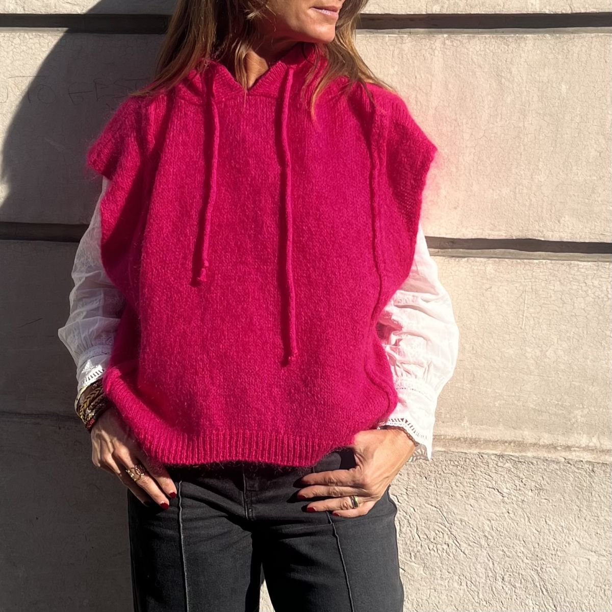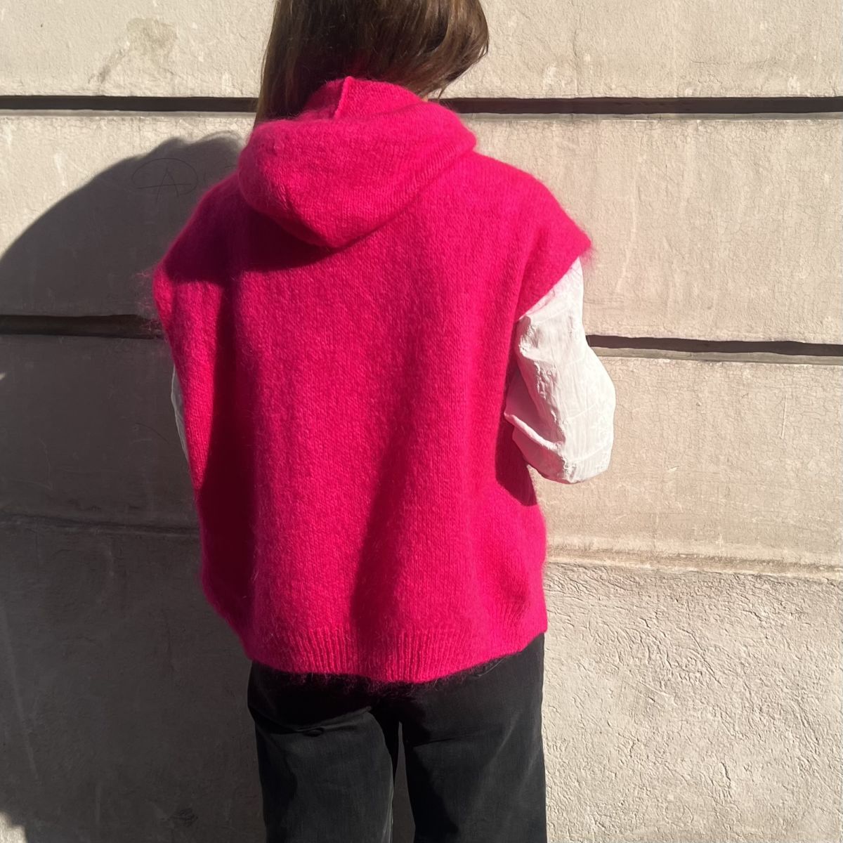 Ajoutez une touche de douceur et de chaleur à votre garde-robe avec ce pull Solal fuchsia fluo à capuche et sans manches ultra confortable.