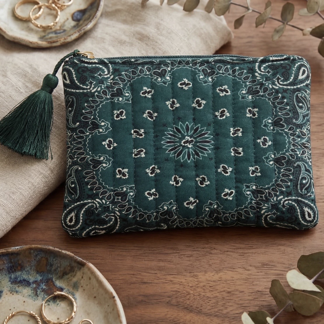 Cette pochette imprimé bandana verte est souple en tissu matelassé. Fermeture éclair avec pompon. A glisser dans votre sac pour ranger votre make-up, vos papiers, …