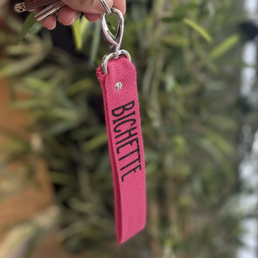 Découvrez ce porte-clés “Bichette” fuchsia avec une inscription noire qui est le cadeau parfait. Ce porte-clés sangle avec inscription est un beau cadeau d’anniversaire ou pour faire un petit clin d’oeil !