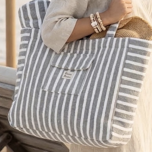 Ce cabas Alix à rayures grises et blanches est un grand cabas en coton rectangulaire porté épaule. Style simple et tendance. Coton épais résistante et léger. Poche extérieure avec petite étiquette « Bisou bisou »