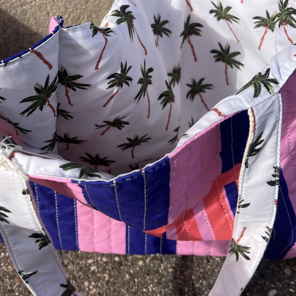 Cabas « CIAO» rectangulaire matelassé à rayures. Intérieur imprimé. Réversible. 2 grandes anses