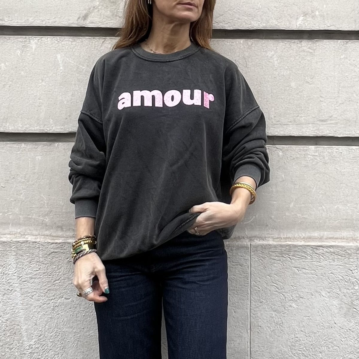 Ce sweat « amour » noir délavé et rose pailleté est le cadeau idéal à offrir ou à s’offrir. Coupe très facile à porter.