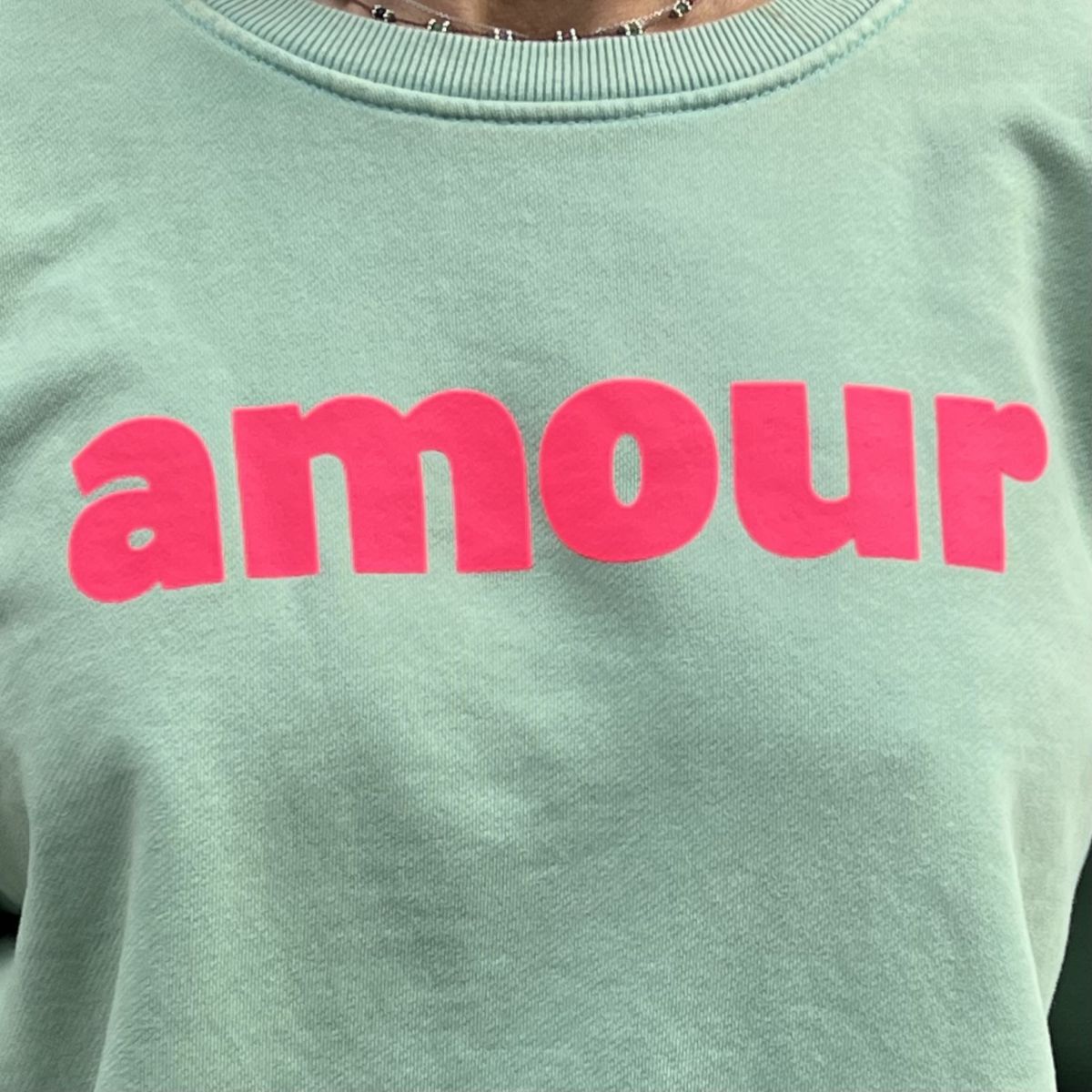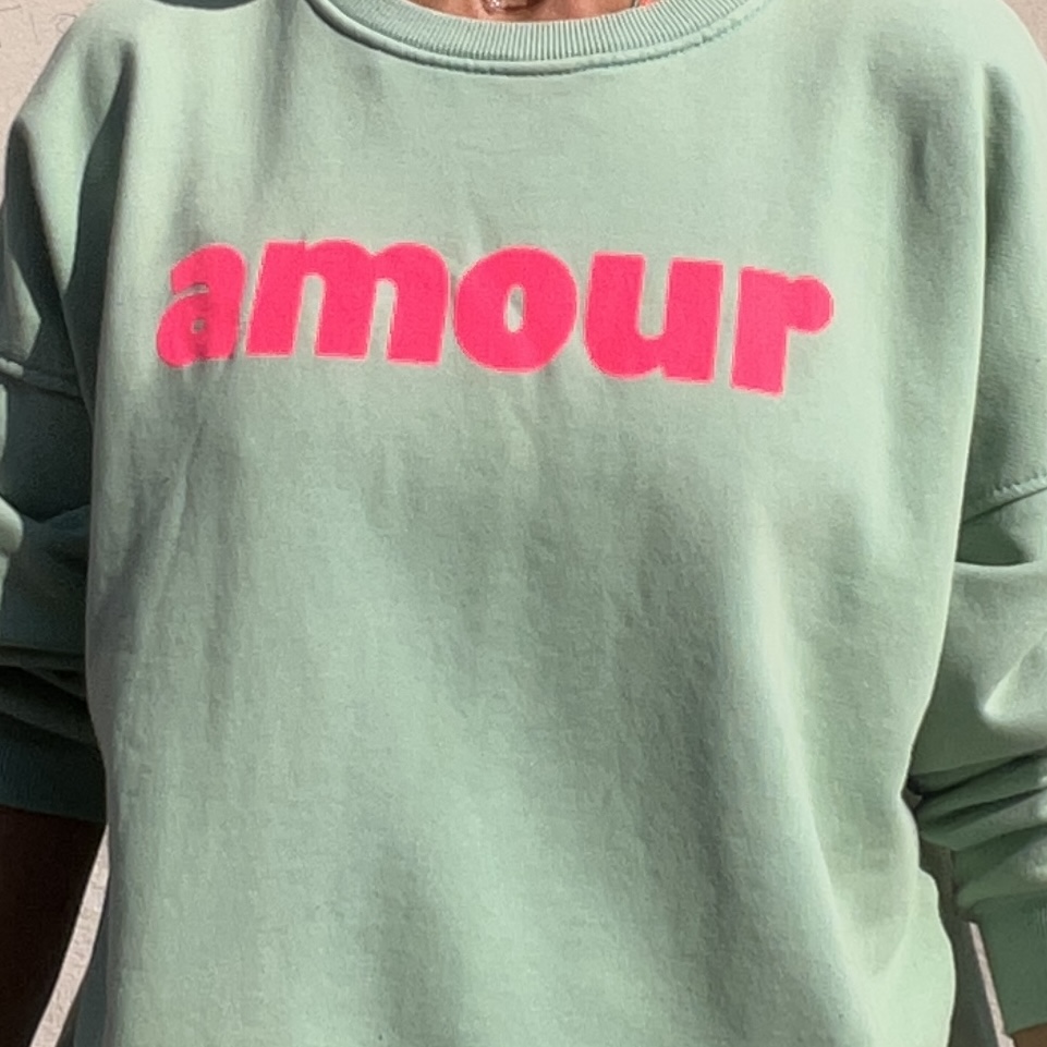 Ce sweat « amour » vert et rose fluo est le cadeau idéal à offrir ou à s’offrir. Coupe très facile à porter.