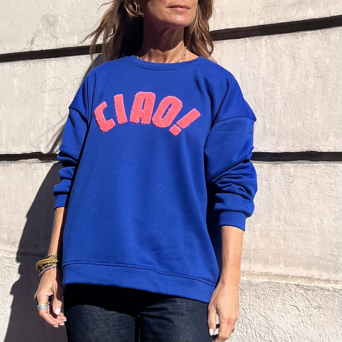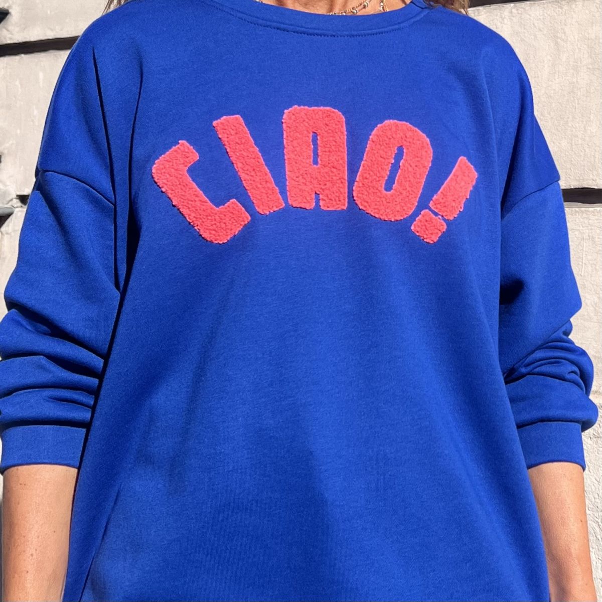 Ce sweat « Ciao » bleu électrique est le cadeau idéal à offrir ou à s’offrir. Coupe très facile à porter. Inscription corail