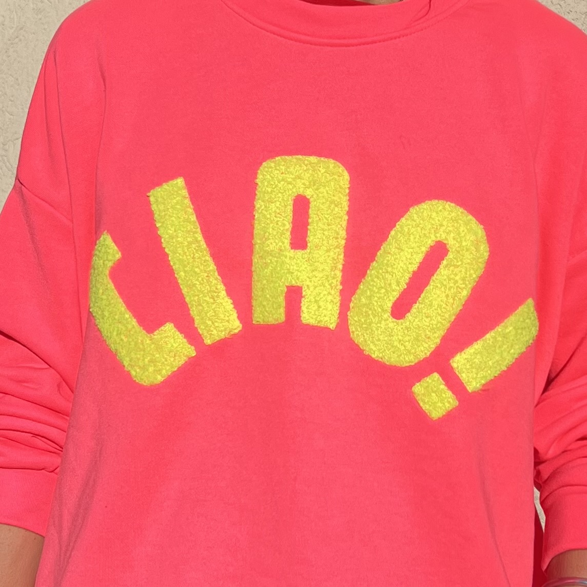 Ce sweat « Ciao » corail est le cadeau idéal à offrir ou à s’offrir. Coupe très facile à porter. Inscription jaune fluo.