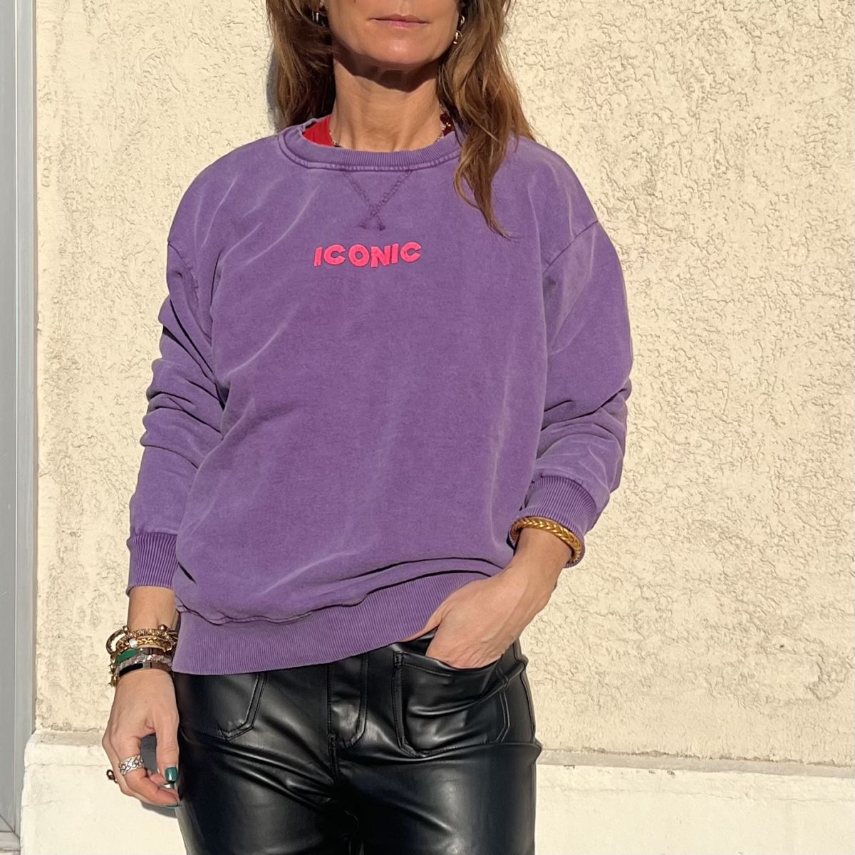 Ce sweat « Iconic » violet est le cadeau idéal à offrir ou à s’offrir. Coupe très facile à porter. Inscription rose fluo.