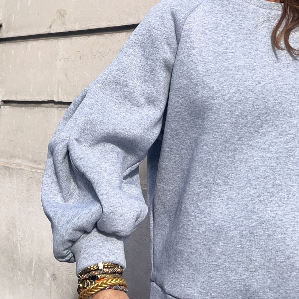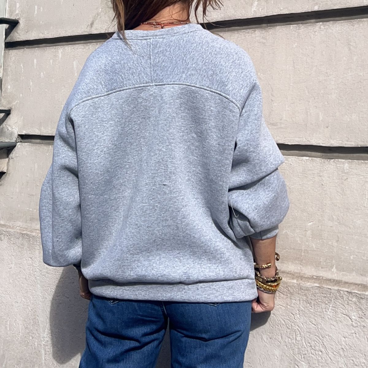 Ce sweat Joseph gris clair chiné a une coupe plutôt oversize avec de jolis détails sur les manches. Tout doux à l’intérieur. Col rond. Taille unique.