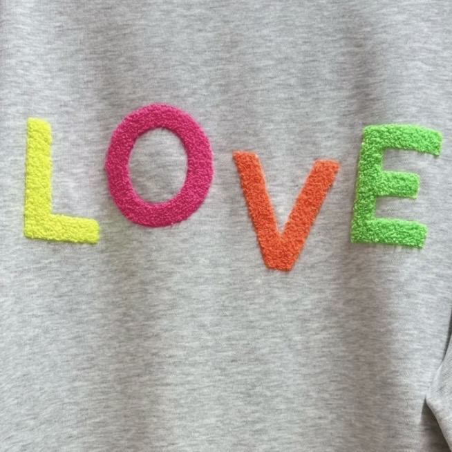 L’inscription LOVE multicolore lui donne un effet joyeux et pop