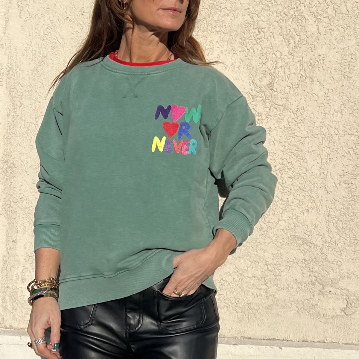 Ce sweat now or never vert est le cadeau idéal à offrir ou à s’offrir. Coupe très facile à porter. Inscription multicolore