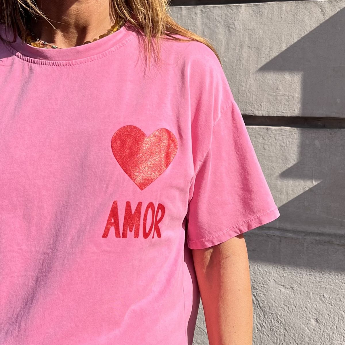 Ce tee-shirt Amor rose est un col rond, manches courtes, coupe loose qui se mariera parfaitement avec toutes vos tenues.
