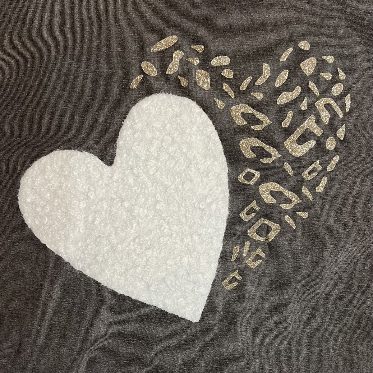 Ce tee-shirt double coeur noir délavé, col V se mariera parfaitement avec toutes vos tenues. Coeur blanc en moumoute et coeur léopard doré
