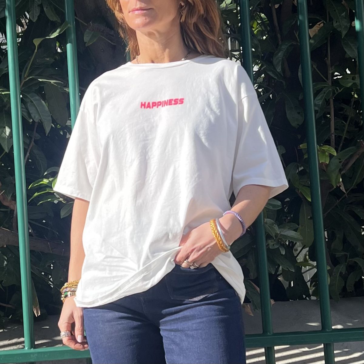 Ce tee-shirt HAPPINESS blanc est un col rond, manches courtes, coupe loose qui se mariera parfaitement avec toutes vos tenues. Petite inscription HAPPINESS rose fluo recto, grosse inscription HAPPINESS et mots verso