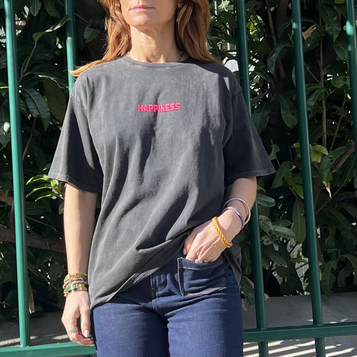 Ce tee-shirt HAPPINESS noir est un col rond, manches courtes, coupe loose qui se mariera parfaitement avec toutes vos tenues. Petite inscription HAPPINESS rose fluo recto, grosse inscription HAPPINESS et mots verso