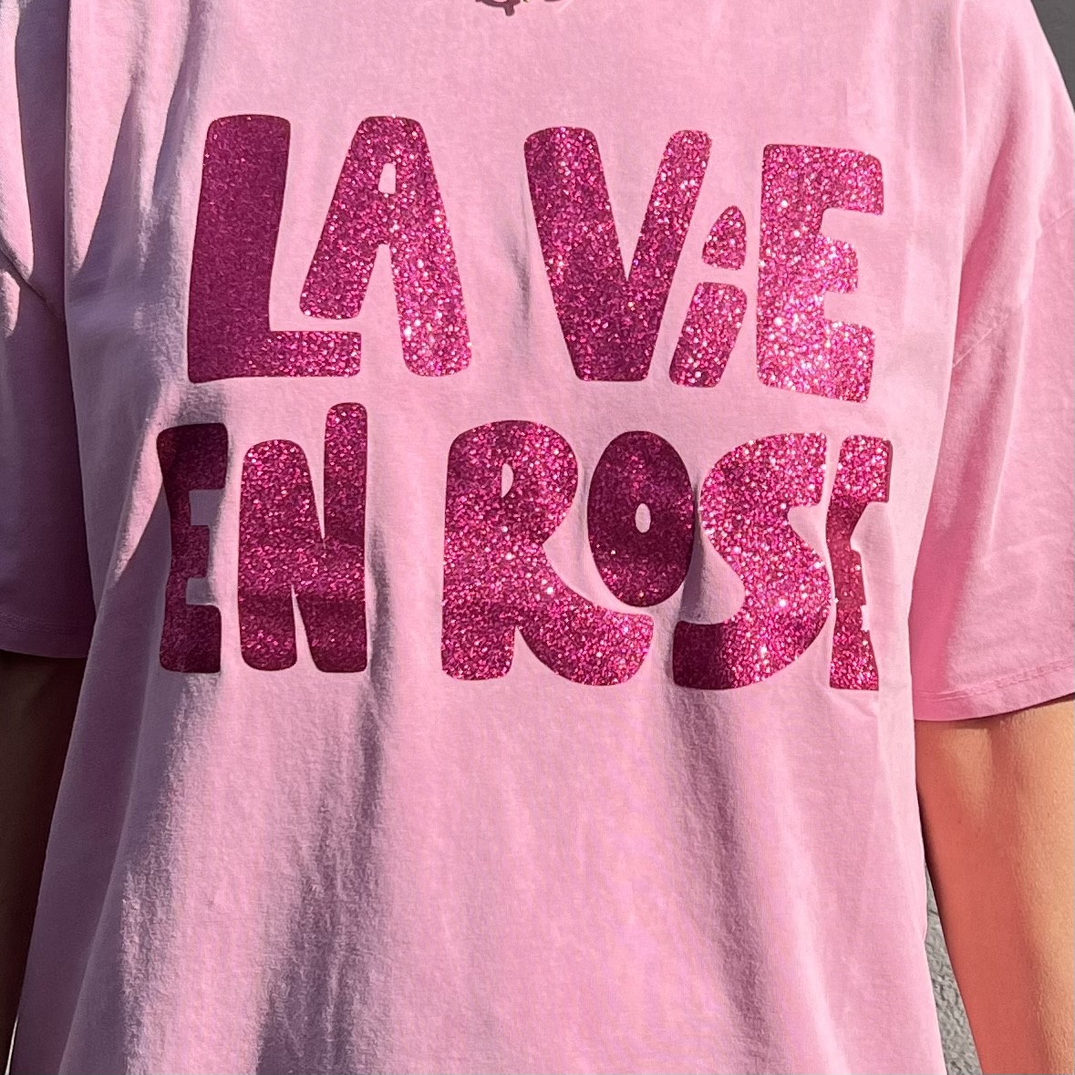 Ce tee-shirt « La vie en rose » rose pailleté est un col rond, manches courtes qui se mariera parfaitement avec toutes vos tenues.