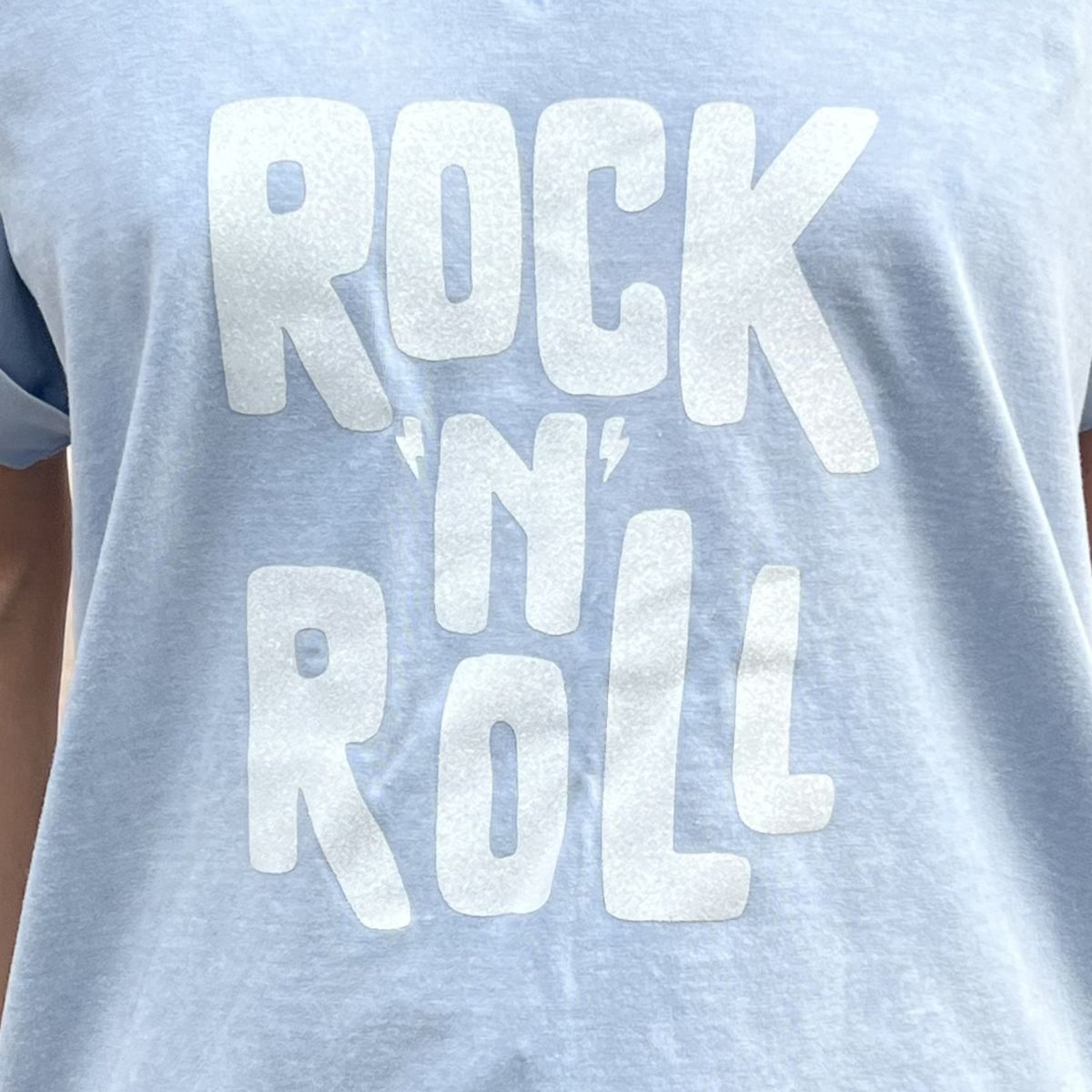 Ce tee-shirt ROCK’N ROLL bleu, col V se mariera parfaitement avec toutes vos tenues. Inscription blanche pailletée.