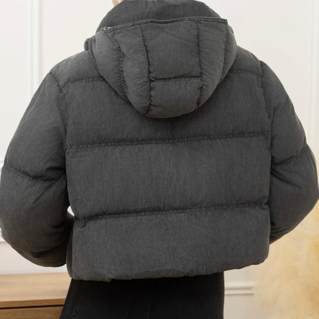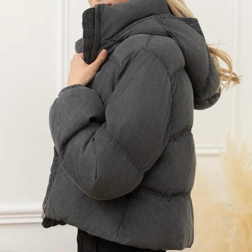 Cette doudoune Claudia grise est une doudoune courte avec capuche qui allie style et confort. Fermeture éclair devant, poignets elastiqués. Style matelassé offrant chaleur et confort. Poches latérales. Existe en 4 tailles, du XS au L. 100% coton