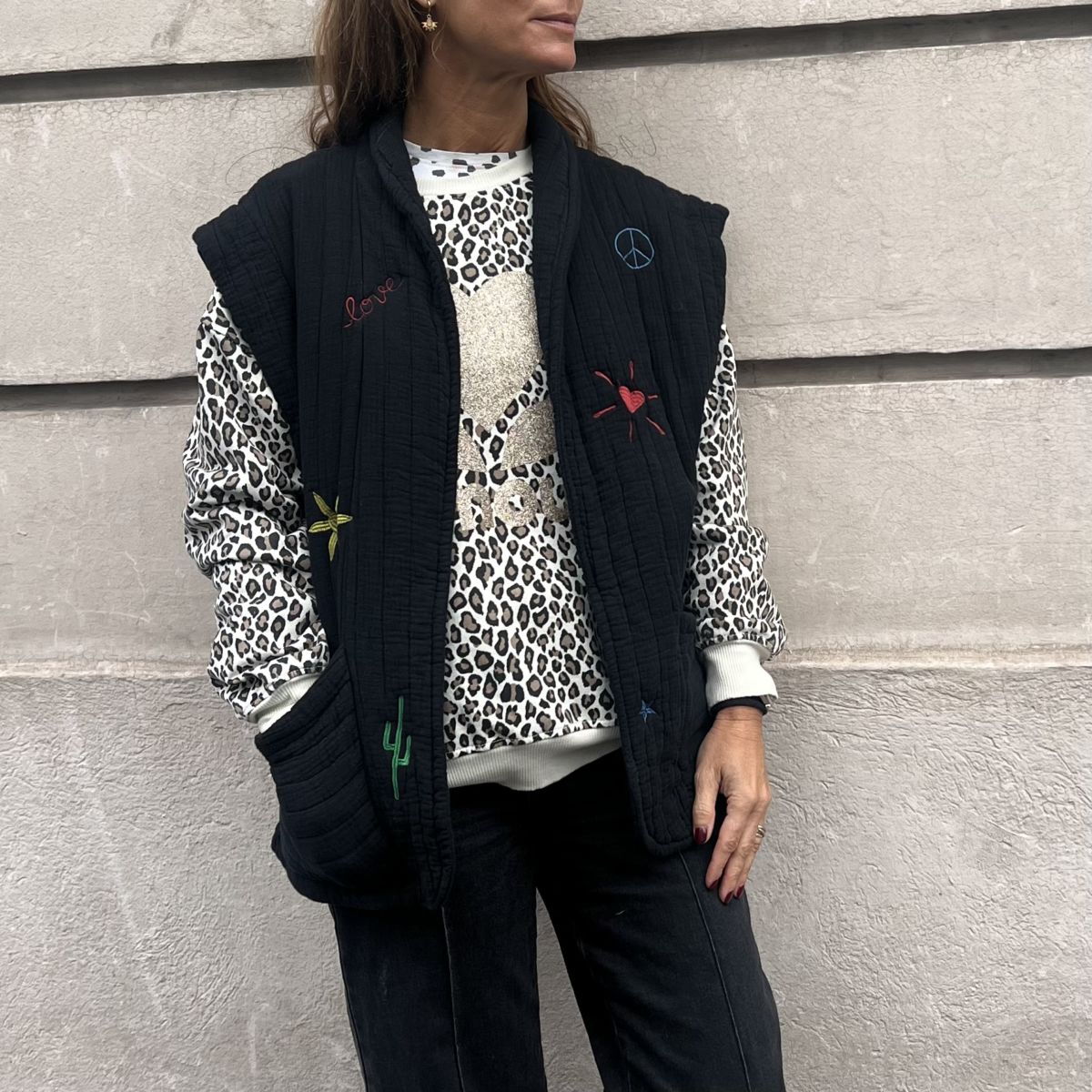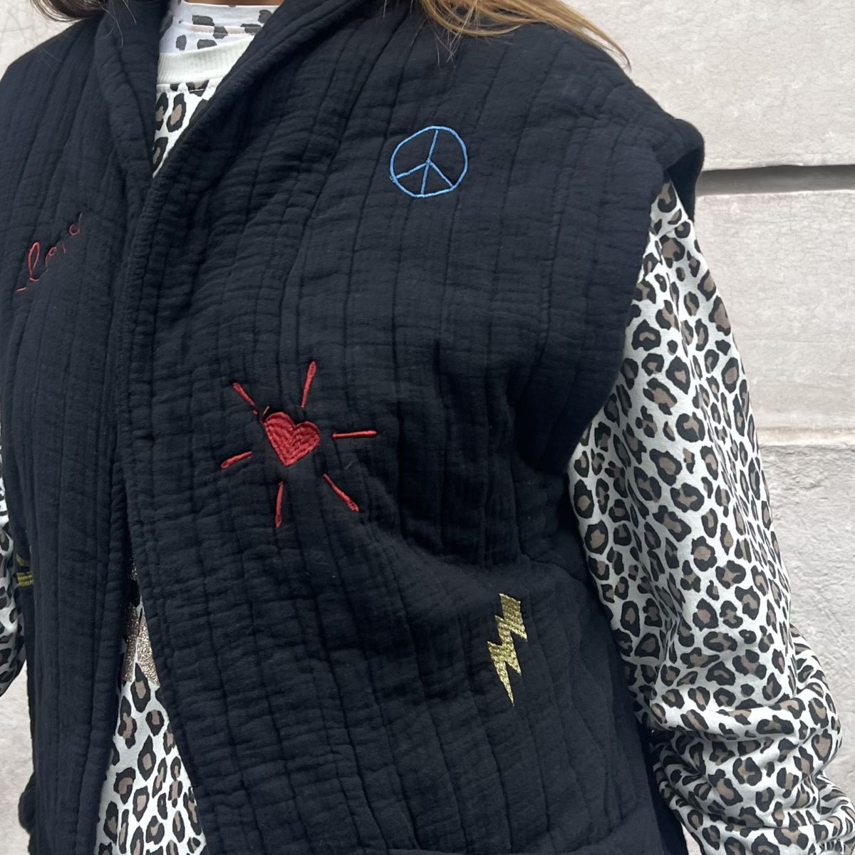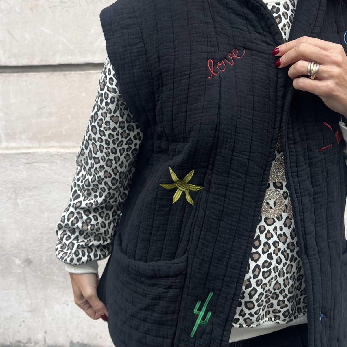 Ce gilet Alexia noir en gaze de coton est le must-have à avoir dans votre dressing. Ultra léger, matelassé, broderies de couleur, sans manche, très tendance pour cette saison!